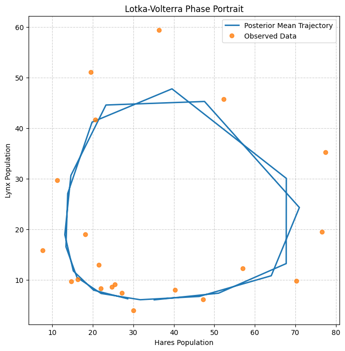Phase portrait of the Lotka-Volterra model. The most core feature of this figure is a closed loop. This is precisely the hallmark dynamical characteristic of predator-prey systems. Compared to the time series figure above, this phase portrait better proves that the model is not just "fitting a few data points" but truly understands and reproduces the internal dynamical feedback mechanisms of this ecosystem. It proves that when the parameters learned by the model (\(\alpha, \beta, \gamma, \delta\)) are combined together, they can generate a theoretical trajectory very similar to the cyclic path observed in the real world.