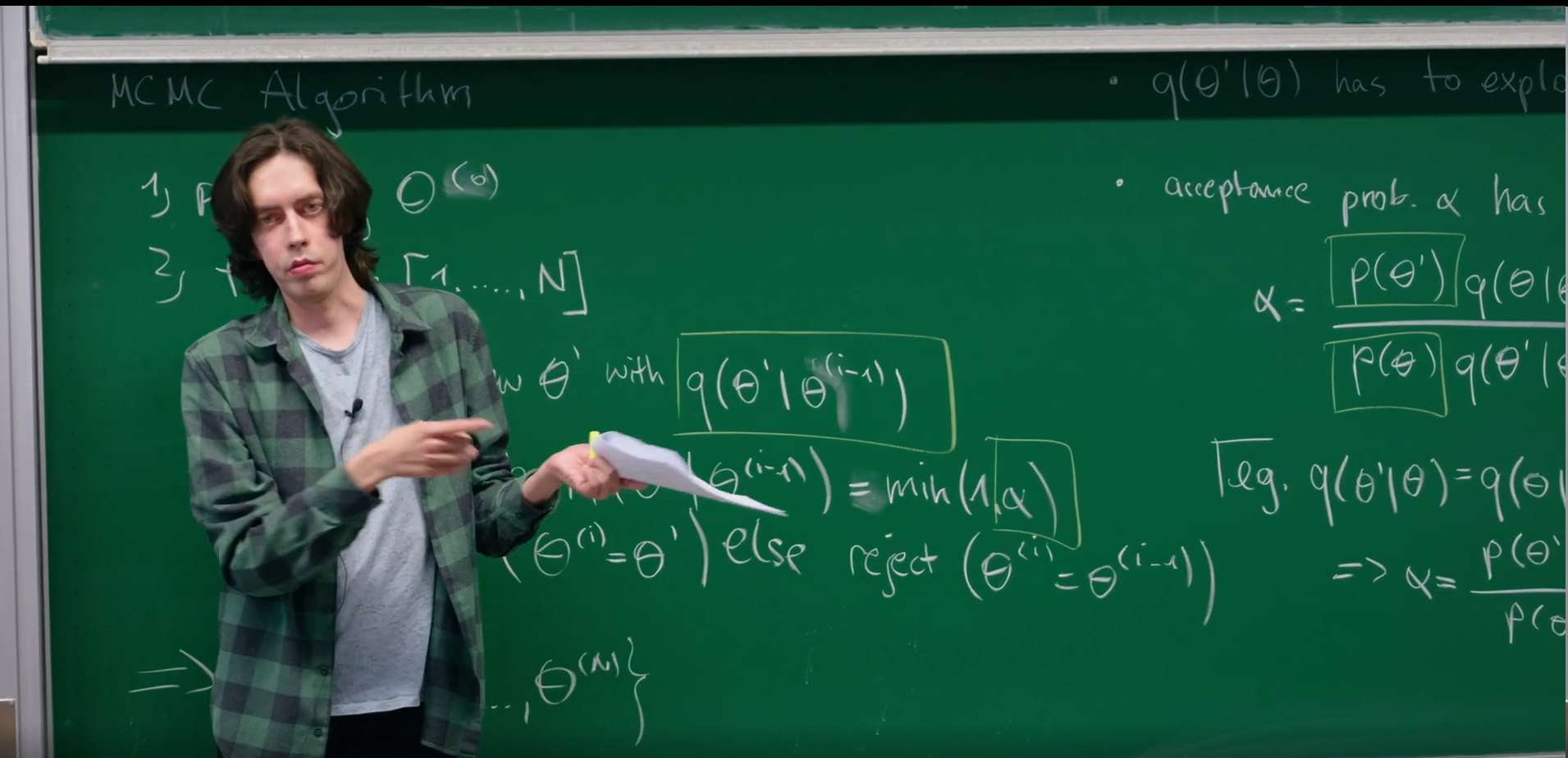 This is very profound. Unlike random walk Metropolis, the accept/reject step in HMC is not the main driver of exploration. The Hamiltonian dynamics are the explorers. The acceptance step is a quality-control check on the numerical integrator. If the integrator does a good job maintaining energy (if \(H' \approx H\)), then the acceptance probability \(\alpha\) approaches 1, as written on the blackboard (\(\alpha \approx 1\)). If the step size \(\epsilon\) is too large, integration errors become large, energy is not conserved, and proposals are (correctly) rejected.