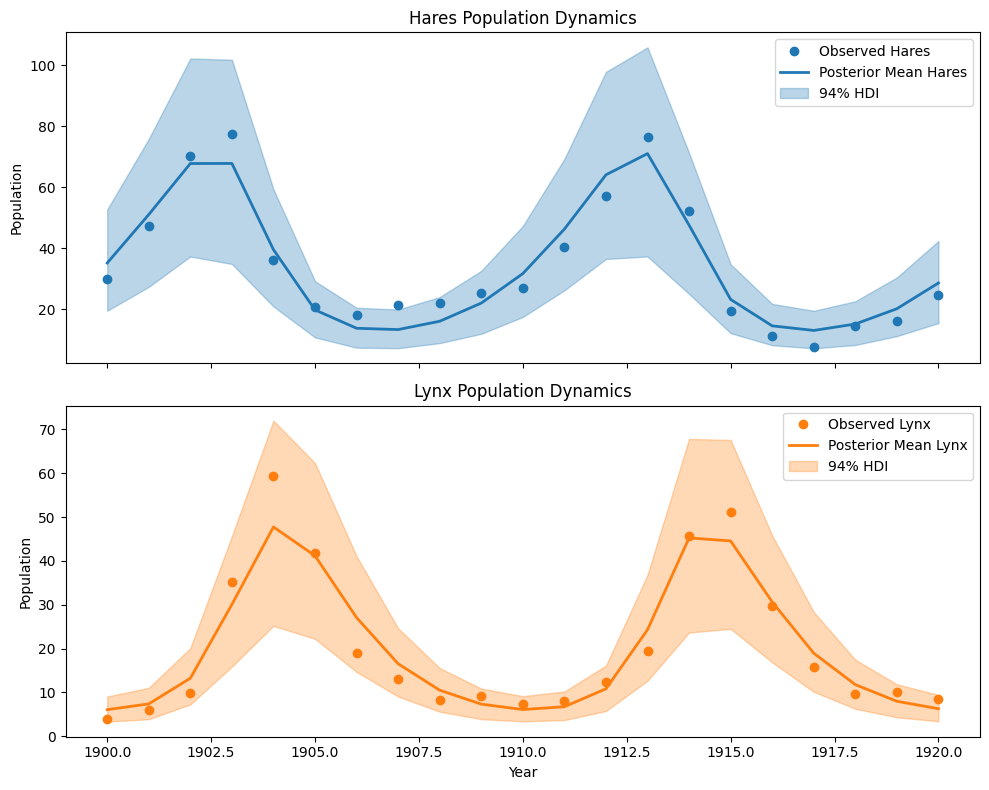 The two solid lines in the figure (blue for hares, orange for lynx) are the model's "best prediction" trajectory (i.e., posterior mean prediction). We can clearly see that this prediction line very successfully captures the periodic fluctuation patterns of both species' populations over time. The hare population reaches its peak first, followed by the lynx population as a food source; the increase in lynx numbers leads to heavy predation and reduction of hares, then lynx also decrease due to food shortage, and the cycle repeats.