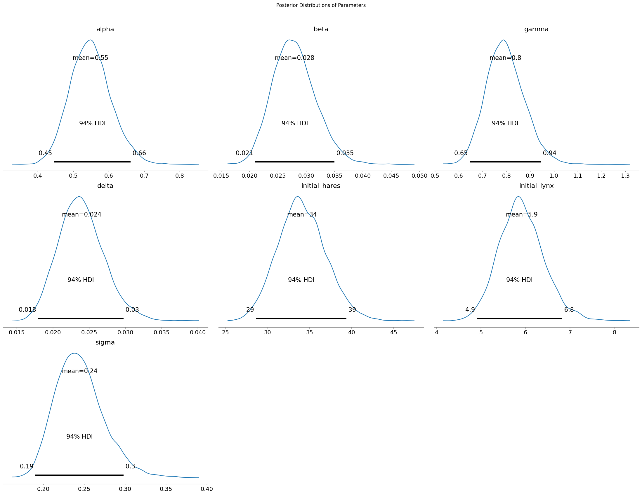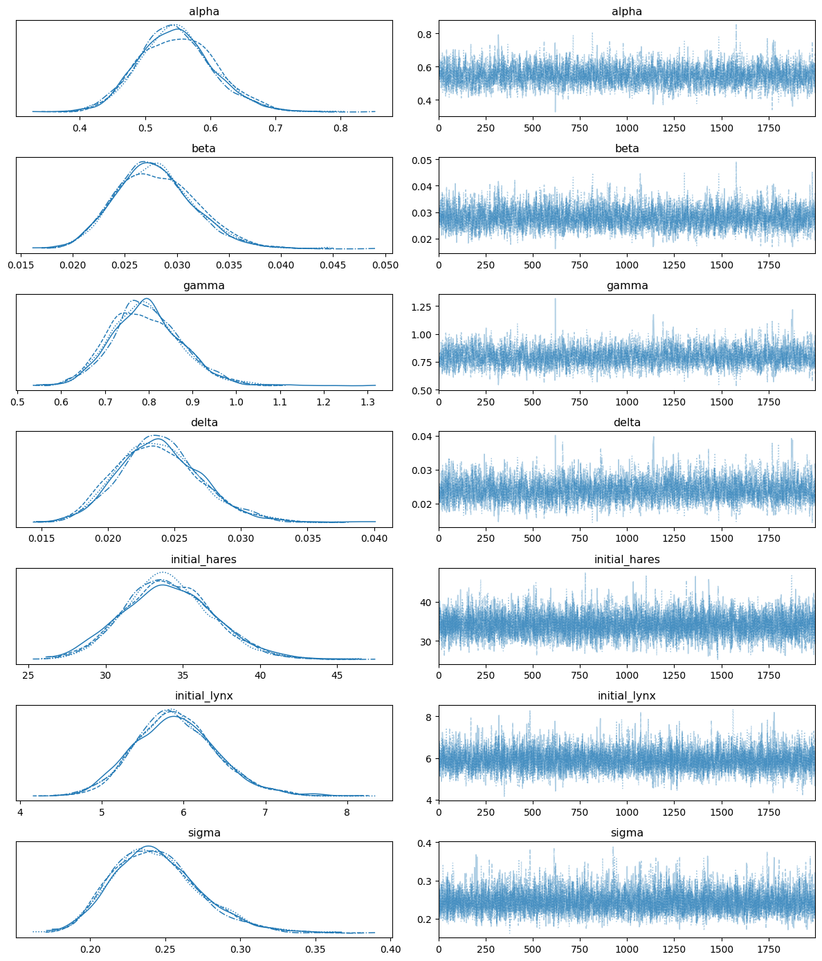 var_names=["alpha", "beta", "gamma", "delta", "initial_hares", "initial_lynx", "sigma"],