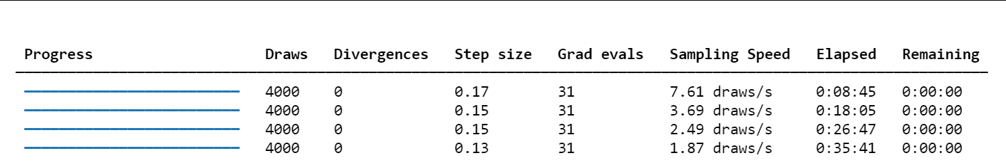 We can see that compared to the Metropolis-Hastings MCMC code we implemented in the previous lecture, this code runs longer. The fundamental reason is that it uses the computationally more expensive Hamiltonian Monte Carlo (HMC) algorithm. In each iteration, Metropolis-Hastings only needs to numerically solve the differential equation (ODE) once to calculate the likelihood; while HMC, to achieve more efficient parameter space exploration, not only needs to solve the ODE but must also solve a more complex adjoint differential equation system through sunode to obtain the gradient of the posterior probability, and use this gradient information to simulate a complete trajectory to produce the next sample point.