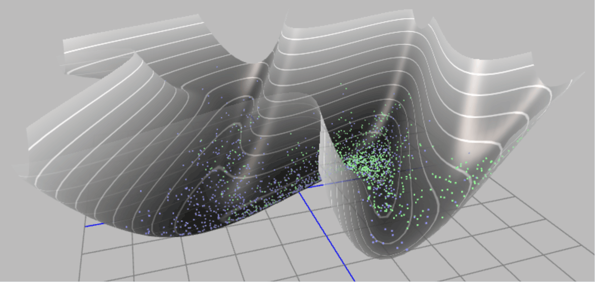 From "blind" to "directed": Our original goal was to find regions with high \(p(\theta)\) values in high-dimensional space. Now, our equivalent new goal is to explore regions with low potential energy \(E(\theta)\). This successfully transforms a purely statistical sampling problem into a problem of exploring an energy landscape with rich physical intuition. The high-probability "peaks" in \(p(\theta)\) have now become deep "valleys" in the \(E(\theta)\) energy landscape.