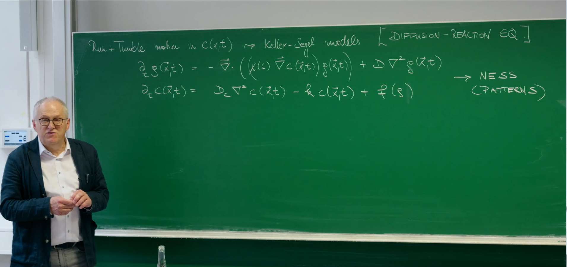 In the previous lecture, we studied chemotaxis and the classic Keller-Segel model, which describes how biological populations (e.g., bacteria) aggregate in response to chemical gradients. To better understand this lecture's content, we briefly recall its core idea. The Keller-Segel model consists of coupled reaction-diffusion equations that describe the spatiotemporal evolution of the particle (e.g., bacterial) density \((g(\vec{x},t))\) and chemical concentration \((c(\vec{x},t))\).