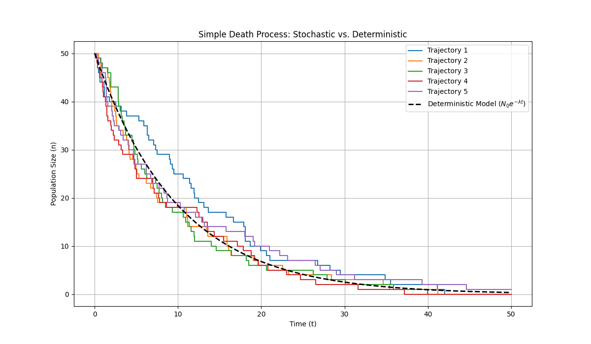 Running this code will show multiple colored step-like curves, each representing a simulated random history. You will find that although their overall trend is downward, the specific timing of decline and the final extinction time (when the curve touches the horizontal axis) are all random. The black dashed line represents the solution of the deterministic model, depicting the average behavior of all random trajectories. This comparison vividly demonstrates the rich dynamics that stochastic models can capture.