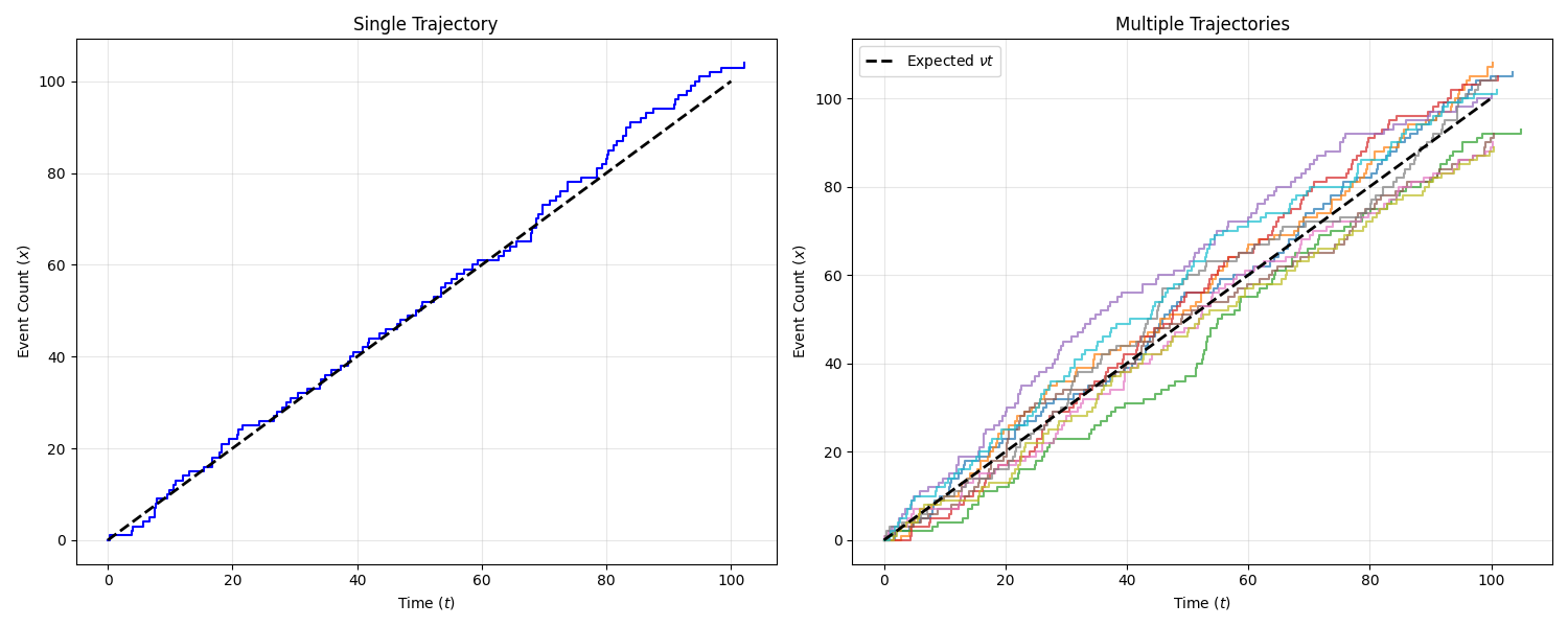 Below is an example Python code implementing the Gillespie algorithm to simulate the Poisson process. The code will generate and reproduce the trajectories shown in the PPT.