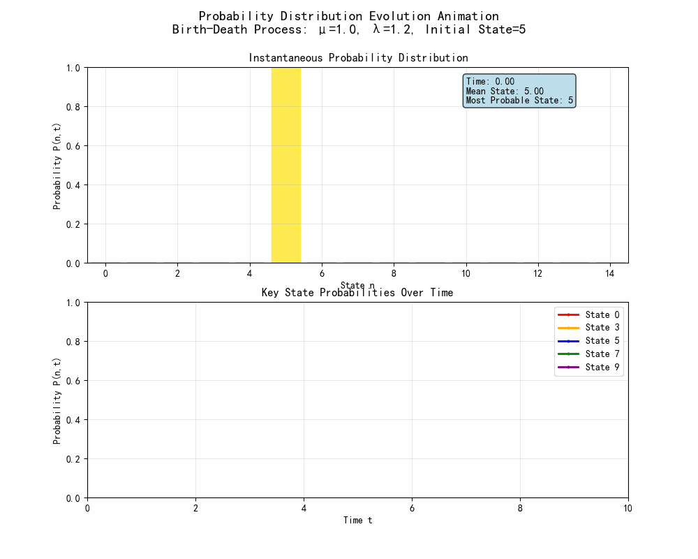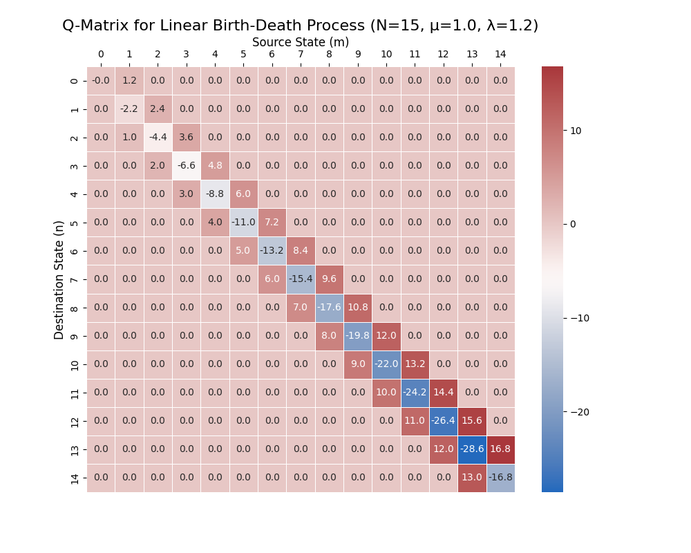 This example demonstrates a profound principle: the structure of the Q matrix is the direct "fingerprint" of the system's microscopic dynamical rules. The birth-death process only allows population size changes of \(\pm 1\), which constitutes "nearest-neighbor" jumps in the state space. When we translate these rules into a Q matrix, we naturally obtain a sparse matrix with only the main diagonal and the immediately adjacent upper and lower diagonals being non-zero. This is a universal law: the sparsity pattern of the Q matrix directly reflects the connectivity of the state-space graph. A tridiagonal matrix means the states form a one-dimensional chain. Conversely, if a Q matrix is dense, it means any state can directly transition to any other state.