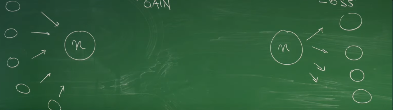 Total gain sums contributions over all \(m\ne n\): \(\sum_{m\ne n}w(n,m)P(m,\tau)\).