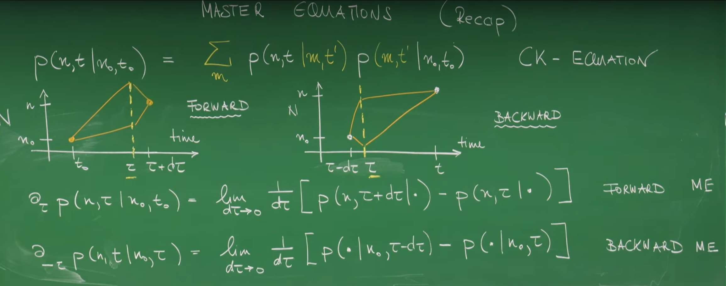 - Forward equation: fix \((n_0,t_0)\) and an intermediate time \(t'\), and study how \(P(n,t\mid\cdot)\) evolves forward in \(t\).