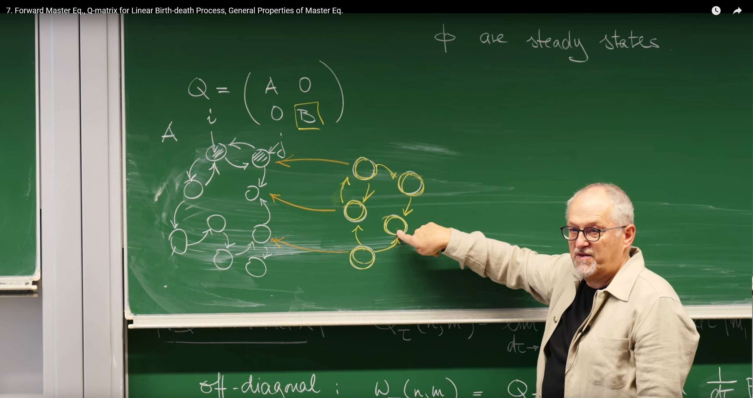 This lecture, led by Professor Erwin Frey, derives that more powerful tool: a differential equation for the instantaneous rate of change of a probability distribution (the master equation). By pushing the finite time step in CK to an infinitesimal limit, we pass from an integral equation about finite-time jumps to a differential equation about instantaneous probability flow. This shift from global to local is both mathematically convenient and physically intuitive.