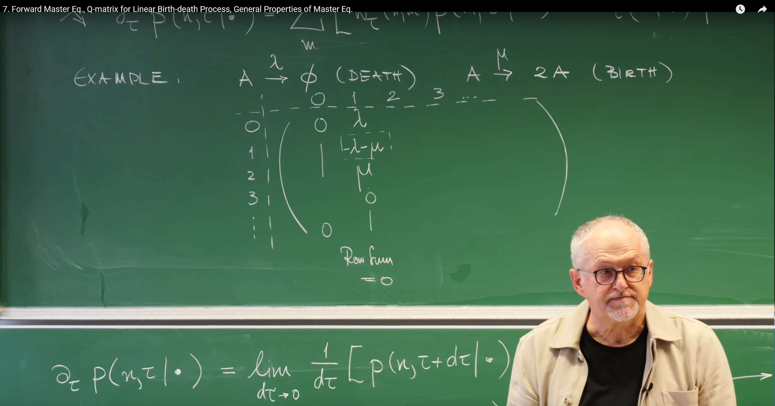 - The diagonal element \(Q_{n,n}\) is the negative total exit rate. From state \(n\), the system can only transition to \(n+1\) or \(n-1\). Therefore, the total exit rate is the sum of the rates of these two processes: \(w(n) = w(n+1,n) + w(n-1,n) = \mu n + \lambda n = (\mu + \lambda)n\).
