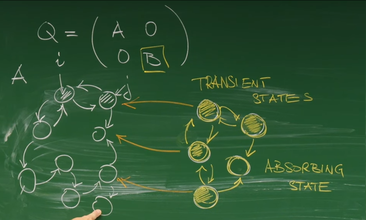 Irreducibility: a system (or subset) is irreducible if every state can reach every other in finitely many steps; otherwise it is reducible. A block-diagonal \(Q\) indicates a reducible system, corresponding to two independent subsystems \(A\) and \(B\) that do not communicate with each other,