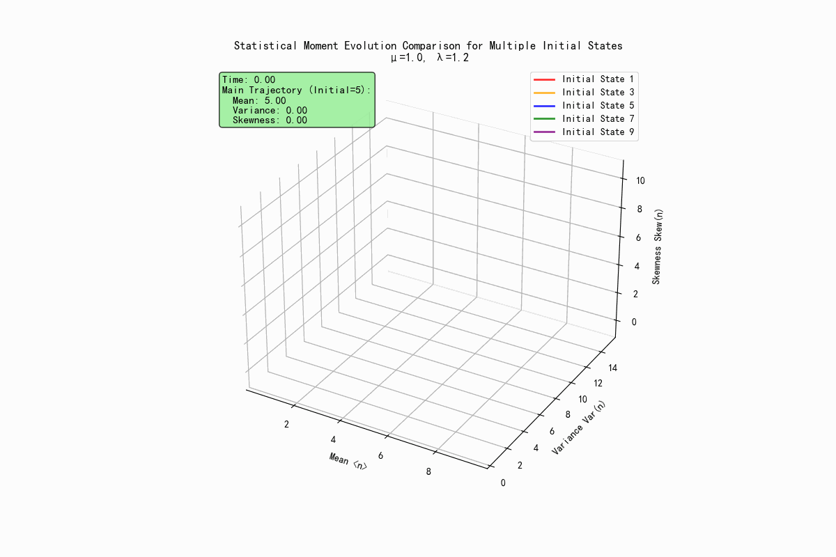 ax.set_title(f'Statistical Moment Evolution Comparison for Multiple Initial States\nμ={self.mu}, λ={self.lam}')
