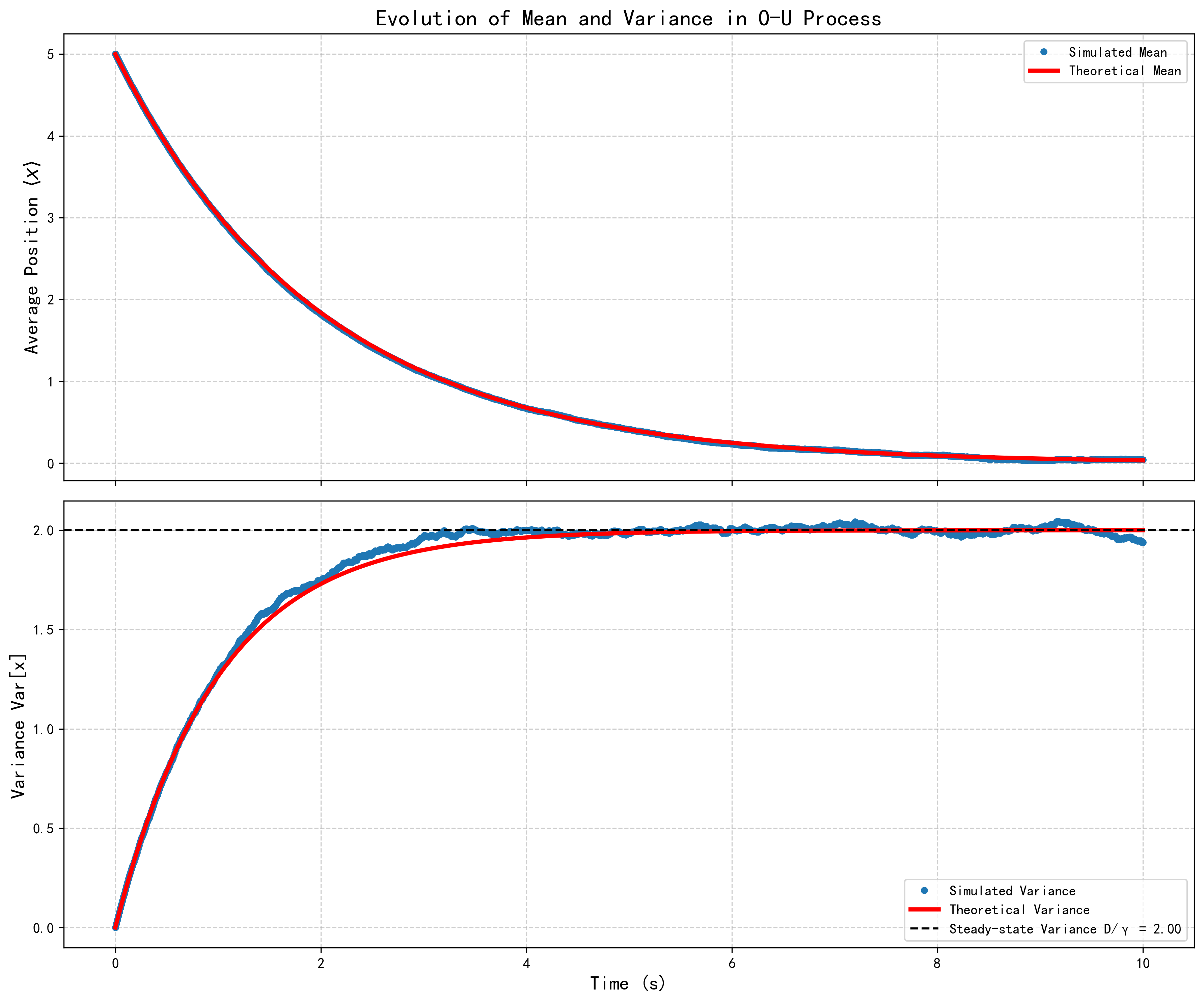 计算出的系综均值和方差与理论公式的曲线重合。我们可以看到均值如何指数衰减到0,以及方差如何从0开始增长并最终饱和到稳态值 \(D/\gamma\)。