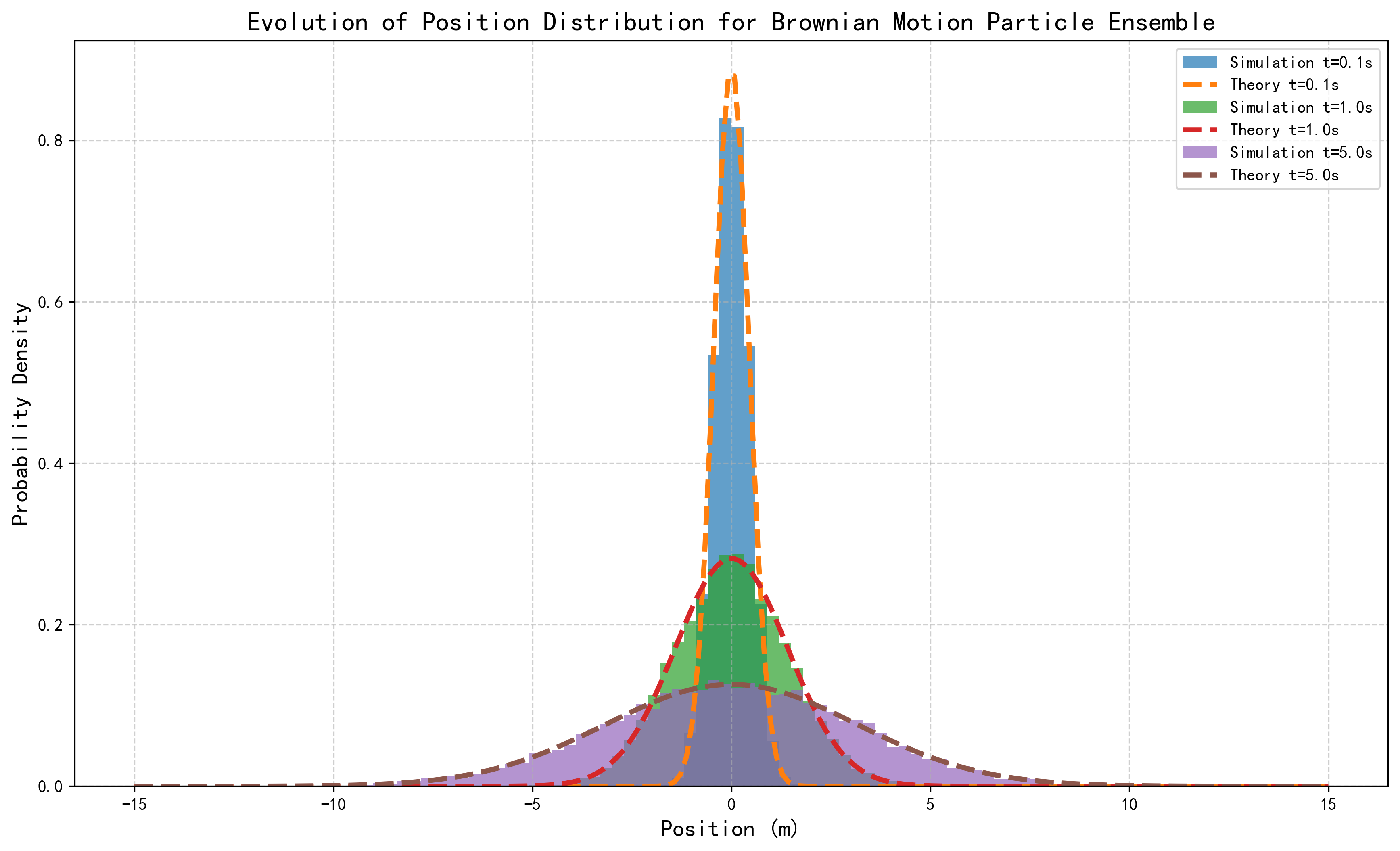 这个模拟展示了理论与实践的统一。尽管每个粒子的路径不可预测,但整个粒子群体的概率分布却以一种完全确定的方式演化:从一个集中在初始位置的尖峰(狄拉克\(\delta\)函数)开始,逐渐展宽成一个越来越宽的高斯分布。模拟得到的直方图与扩散方程的解析解(高斯分布)高度吻合,这有力地证明了福克-普朗克方程是如何从微观的随机行走中涌现出来的宏观确定性规律。