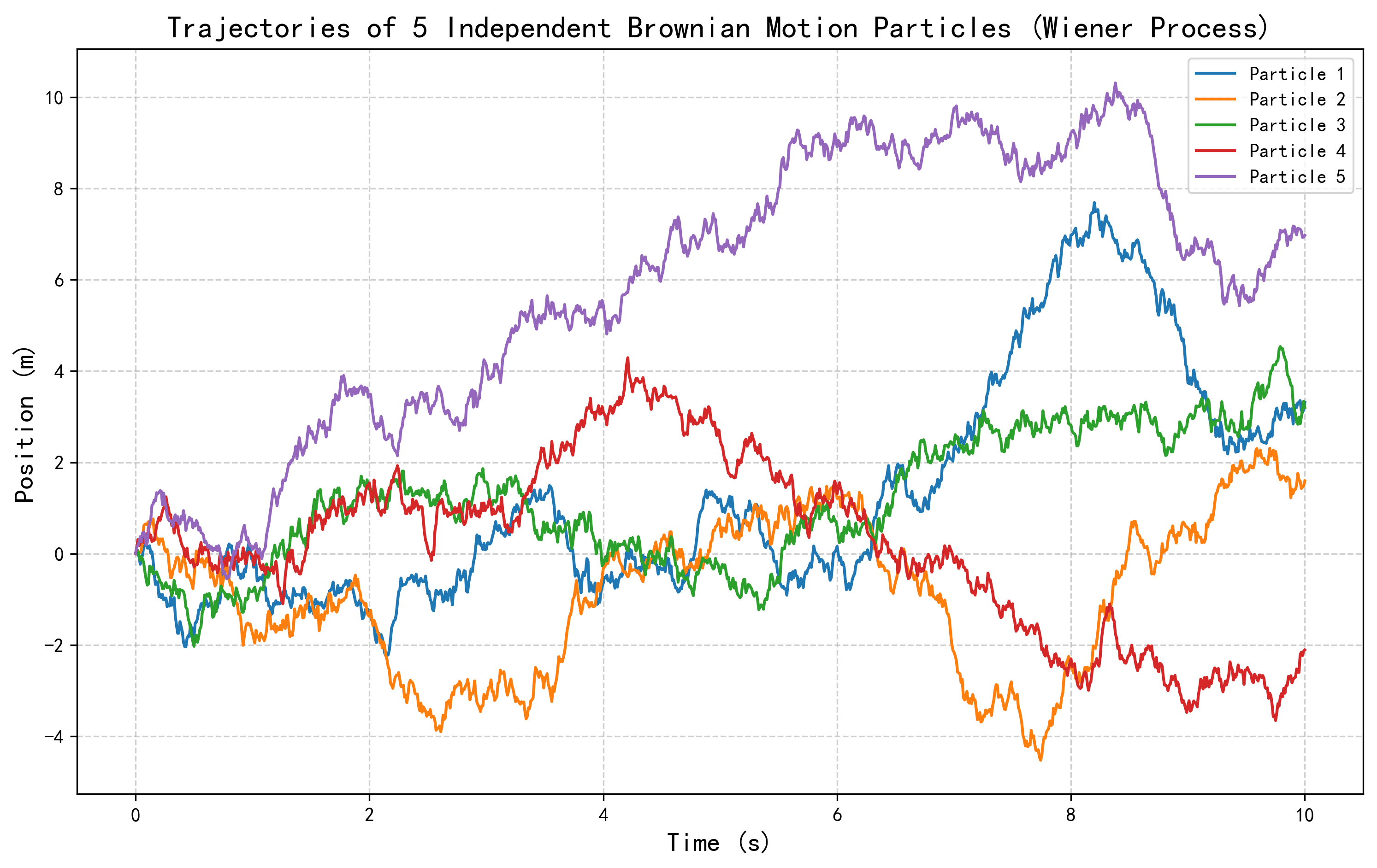 下面的Python代码模拟并绘制了几个独立的布朗运动轨迹。
