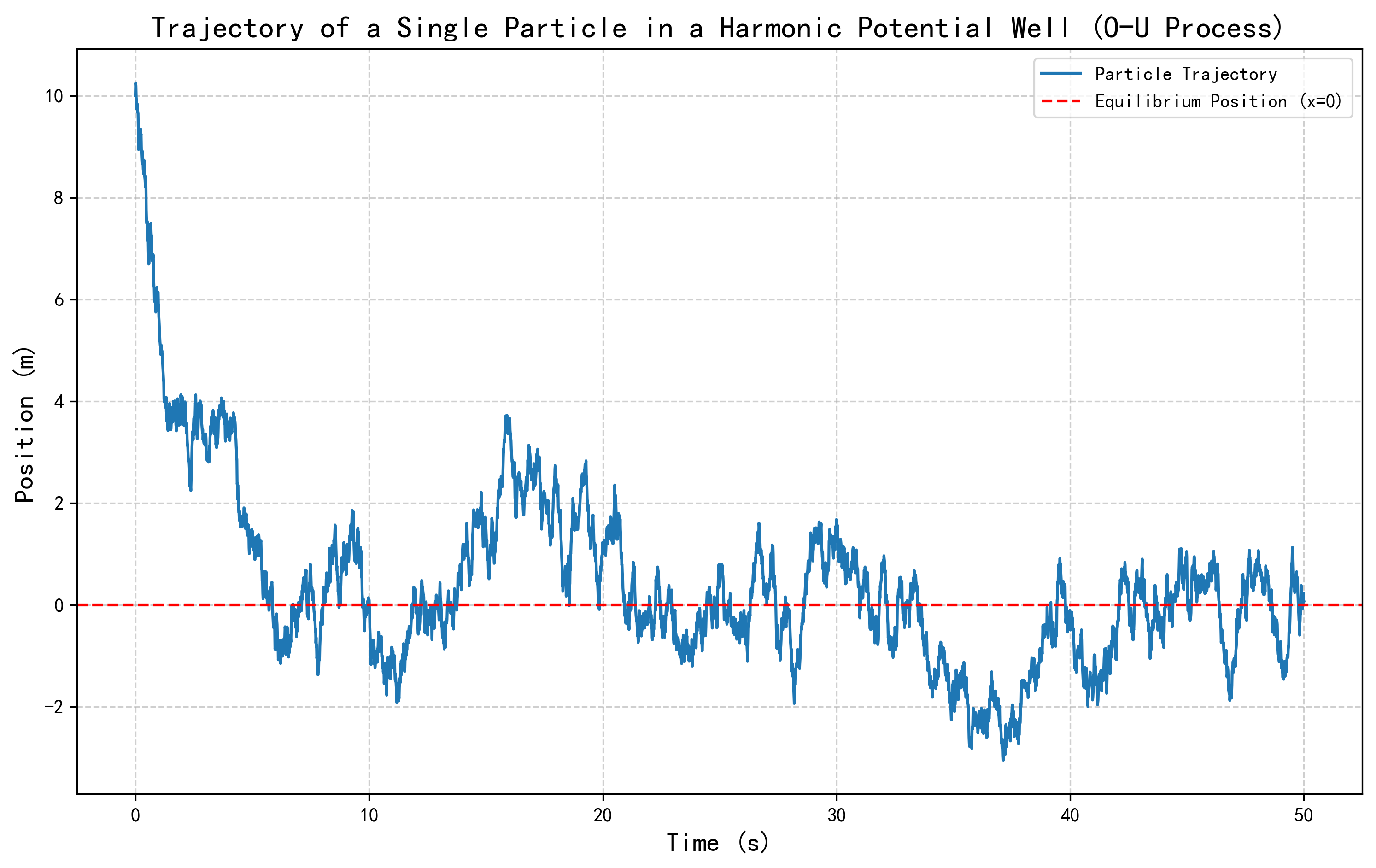 从轨迹图中可以清晰地看到,粒子在原点附近随机波动。当它偶然漂到离原点较远的地方时,强大的恢复力(漂移项)会更明显地把它"拉"回来。最终,粒子的运动被限制在一个以原点为中心的有限区域内。