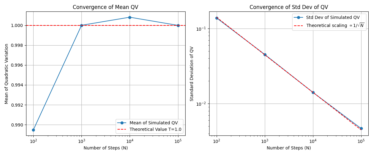 这是一个惊人的结果:随机增量平方和的期望值,恰好等于总的时间长度 \(t\)。这个求和在随机分析中被称为过程的二次变分(Quadratic Variation)。