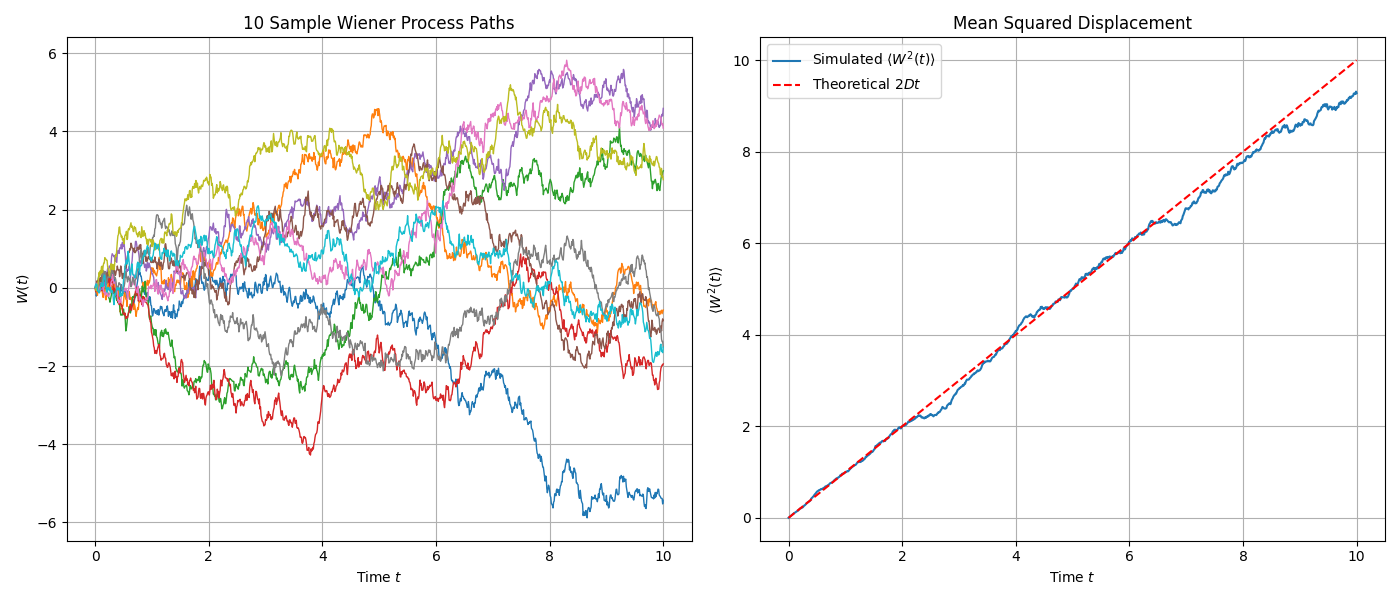 左图展示了10条模拟的维纳过程样本轨迹,它们都从0点出发,进行随机游走。右图将500条轨迹在每个时间点的位移平方进行平均,得到的均方位移(蓝线)与理论值 \(2Dt\)(红色虚线)吻合,验证了扩散过程的核心特性。
