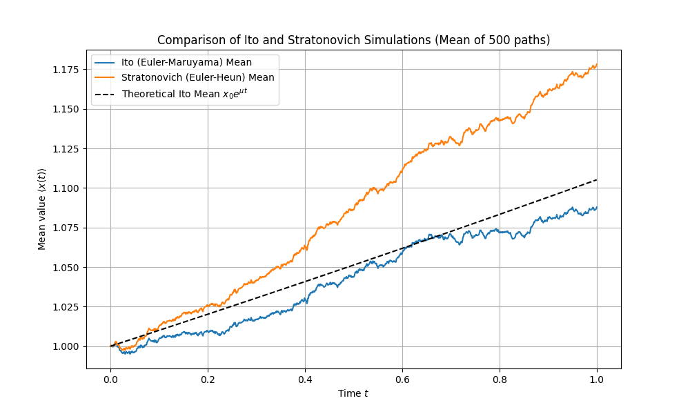 对同一个几何布朗运动SDE进行数值模拟,分别采用伊藤(蓝线)和斯特拉托诺维奇(橙线)的数值格式。图中显示的是500条轨迹的平均路径。可以看到,斯特拉托诺维奇解释下的轨迹平均值系统性地高于伊藤解释下的轨迹,后者与理论上的伊藤解的期望值 \(x_0e^{\mu t}\)(黑色虚线)吻合。这直观地展示了两种不同积分约定导致的有效漂移差异。