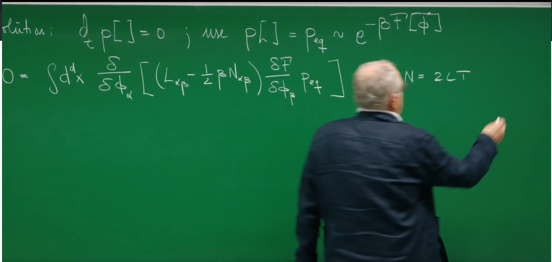 我们知道,当系统达到热平衡时,其概率分布必须是统计物理给出的玻尔兹曼分布 (Boltzmann distribution) ,即 \(P_{eq}[\phi] \propto e^{-F[\phi]/k_B T}\)。这是我们“局域热平衡”假设的必然结果。