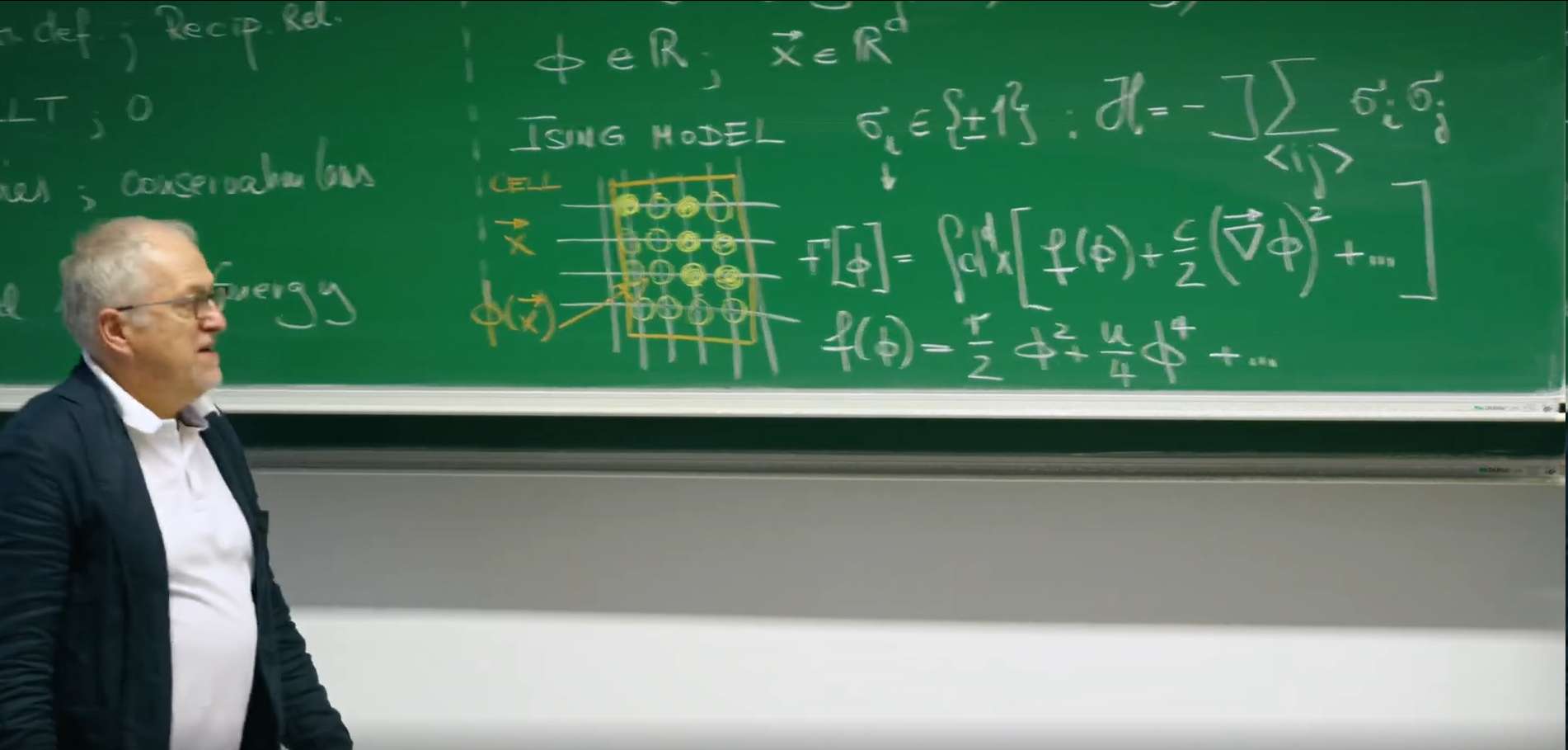 总而言之,我们保留的 \(f(\phi) = \frac{r}{2}\phi^2 + \frac{u}{4}\phi^4\) 和 \(\frac{c}{2}(\nabla \phi)^2\) 是抓住相变物理本质的最简化、最相关的项。省略号提醒我们,这是一个近似理论,但正因为这个巧妙的近似,我们才能构建出一个普适且可解的模型,成功描述一大类不同物理系统的临界行为。