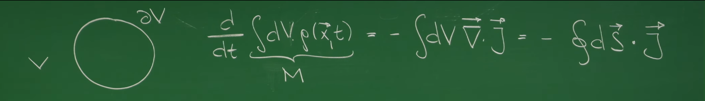 \[\frac{d}{dt} \int_V dV \, \rho = -\oint_{\partial V} d\vec{S} \cdot \vec{J}\]等式右边的负号表示,当净通量为正(向外流)时,内部质量减少。