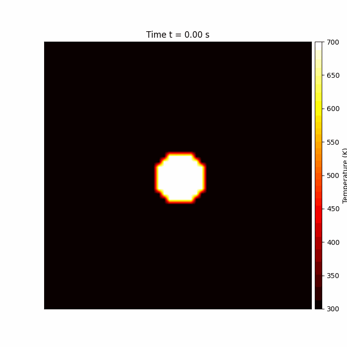 圆形“热点”(亮黄色,温度700K)位于平板中心,周围是低温区域(深红色,温度300K)。这代表了一个具有极大温度梯度 (\(\nabla T\)) 的高度非平衡状态。随着时间推移,我们可以观察到两个同时发生的过程: