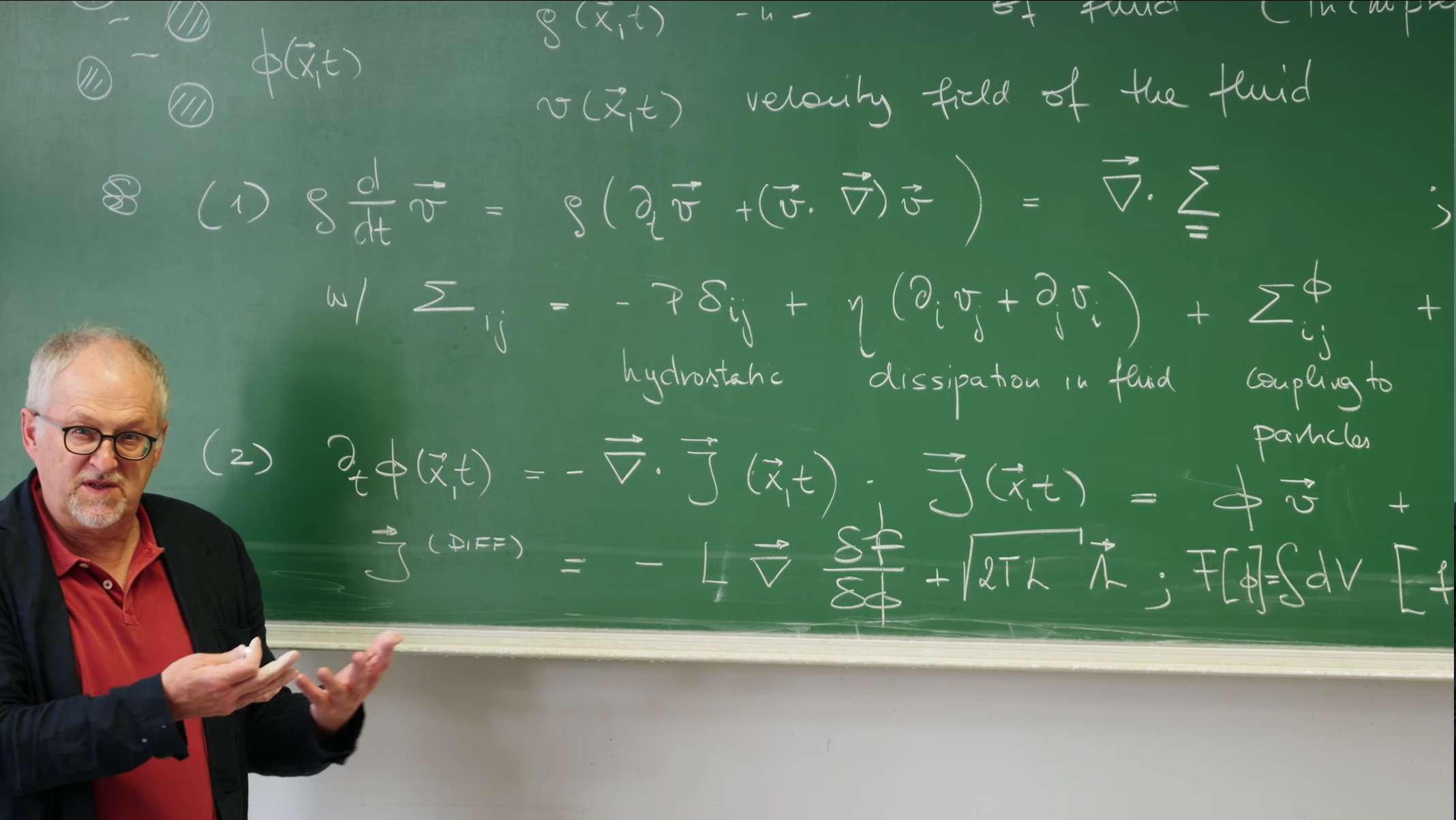 在第29讲的结尾,区分了粒子在静态背景中运动的“干性”系统(如B模型)和悬浮于动态流体中的“湿性”系统。这节课将为这种更复杂的“湿性”系统建立其动力学的基本方程。整个系统的行为由两个核心的、相互耦合的守恒场共同主宰:描述流体运动的速度场 \(\vec{v}(\vec{x}, t)\) 和描述悬浮粒子分布的密度场 \(\phi(\vec{x}, t)\)。