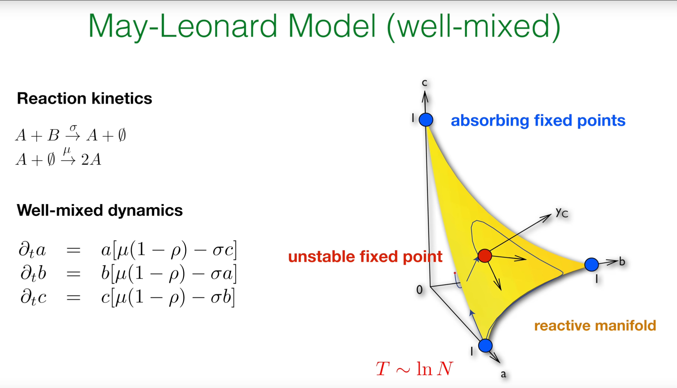 May-Leonard模型由生态学家Robert May和Joseph Leonard于1975年共同提出,其历史背景源于对"竞争排斥原理"的反思——即生态位完全相同的物种无法稳定共存。该模型的物理本质是通过构建一个三维(或更高维)的非线性动力系统(常微分方程组),描述三种物种间存在的循环竞争关系(即A胜B、B胜C、C胜A,形成"石头-剪刀-布"式的非传递性竞争),其核心特征是在确定性的微分方程框架下,由于不存在稳定的不动点,系统会展现出持续振荡和物种丰度的自发随机交替等非平衡行为。该模型的具体应用已远超理论生态学,成为解释生物多样性和空间自组织模式的典范工具,广泛应用于微生物实验系统(如大肠杆菌的循环竞争)、珊瑚礁生态系统演化分析,以及演化博弈论中维持合作行为的机制研究,并为非线性动力学和非平衡统计物理提供了展示中性稳定性、极限环和随机性如何共同维持生物多样性的关键数学模型。