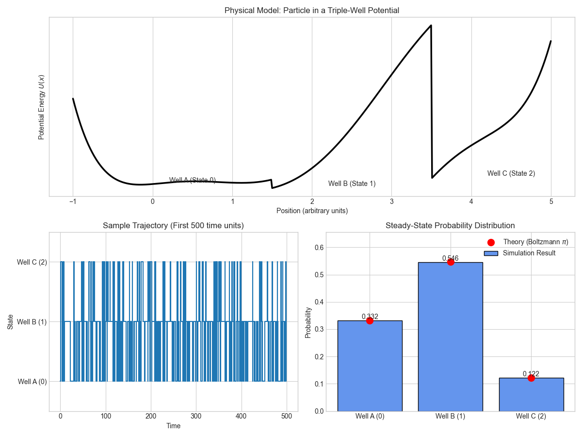 细致平衡 (Detailed Balance) 是一个更强的条件。如果细致平衡成立,我们可以证明稳态条件也必然成立。然而,反过来不一定。系统可以处于一个概率分布恒定,但内部存在持续的、非零的净概率流的稳态。这种状态被称为非平衡稳态 (Non-Equilibrium Steady State, NESS),我们将在第二部分详细探讨。