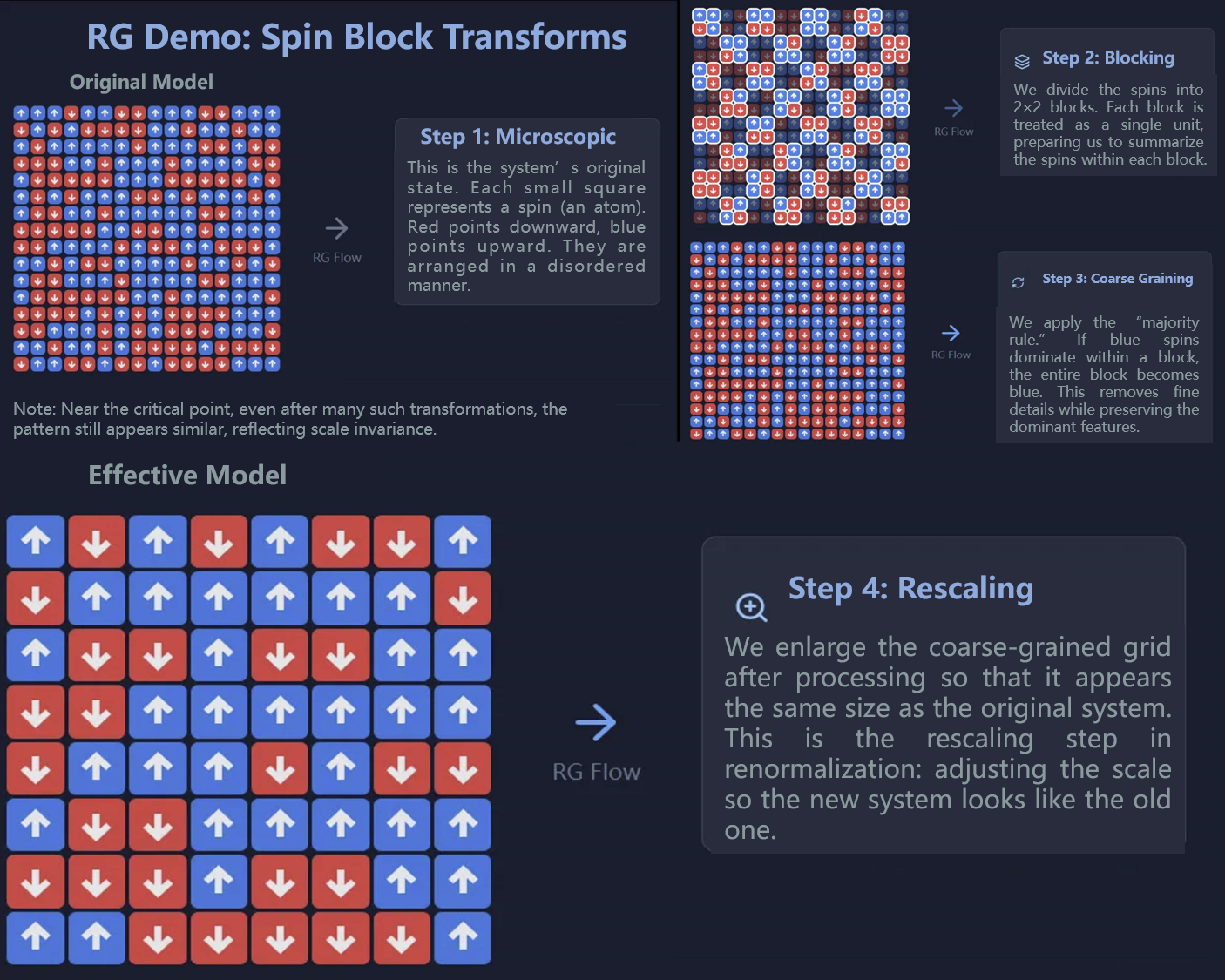 So no matter how many times we coarse-grain, new fluctuations keep appearing; the system never becomes smooth. That is why the critical point is so hard to treat: we cannot remove all fluctuations by local averaging. RG deals with this by turning the problem into the study of fixed points—self-similar limiting states (see below). When the correlation length is finite, the system is like many small “independent blocks,” each coherent internally but loosely coupled to others; when it is infinite, the system is one tightly connected “giant block.”
