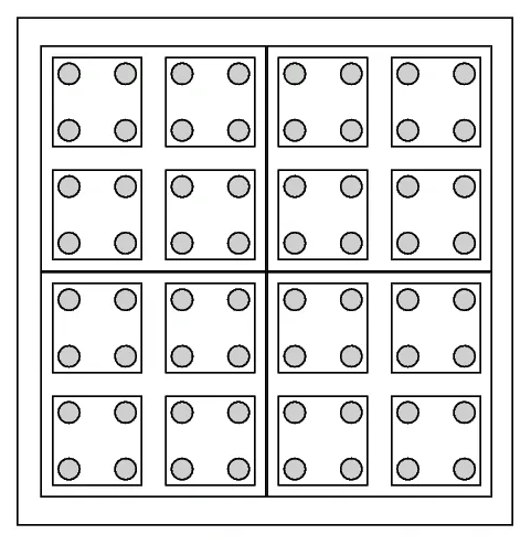 Kadanoff’s “block spin” idea: divide a 2D square lattice into \(2 \times 2\) blocks; the state of each block is represented by one average block variable (in the figure, the gray dot in each large block stands for the average spin replacing the original four spins). This coarse-graining reduces the number of degrees of freedom to one quarter. Repeating this process and increasing the scale, we eventually shrink the system to a single block. Along the way we see how the system’s parameters change and whether they approach a stable value.