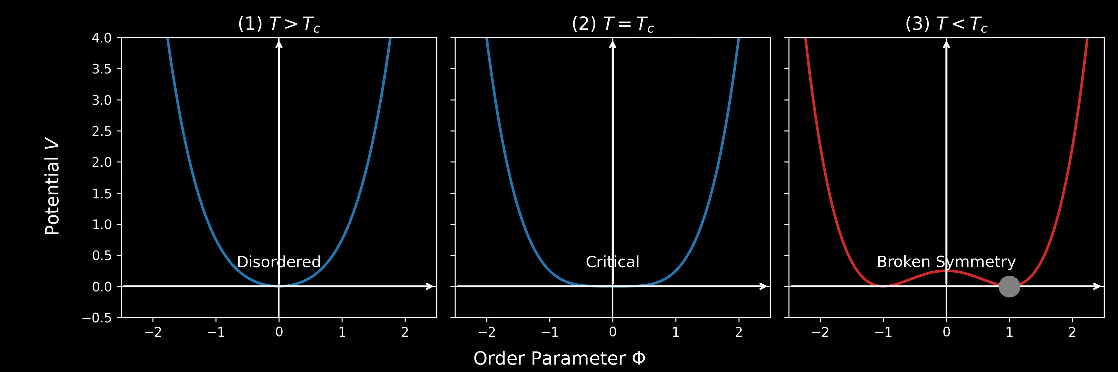 Here \((\nabla \phi)^2\) penalizes abrupt changes in the field (analogous to nearest-neighbor interactions in the Ising model), while the \(\phi^2\) and \(\phi^4\) terms constitute a local potential well.