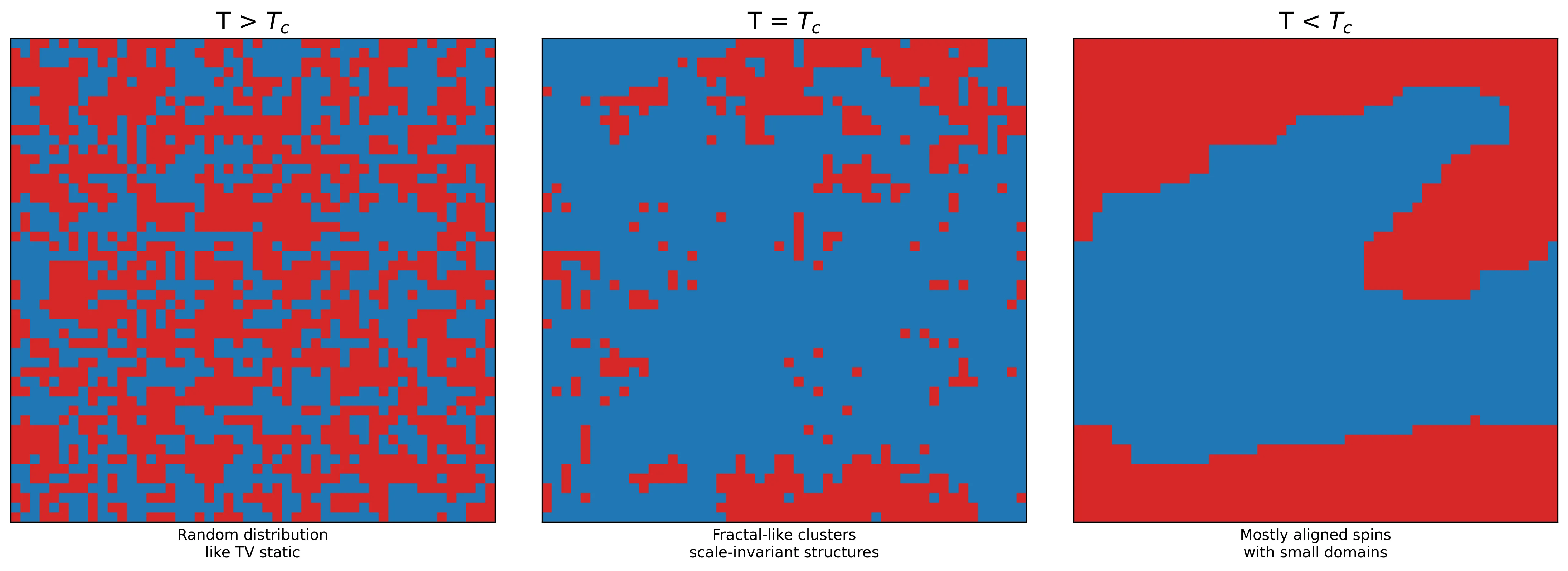 2D Grid Ising Model - Arrows on Lattice Sites Point Up (Blue) or Down (Red). The Figure Should Show Three Cases - High Temperature (Chaotic), Critical Point (Clusters of Various Sizes, Fractal Structure), Low Temperature (Almost All Same Color). Image Source - Self-Drawn