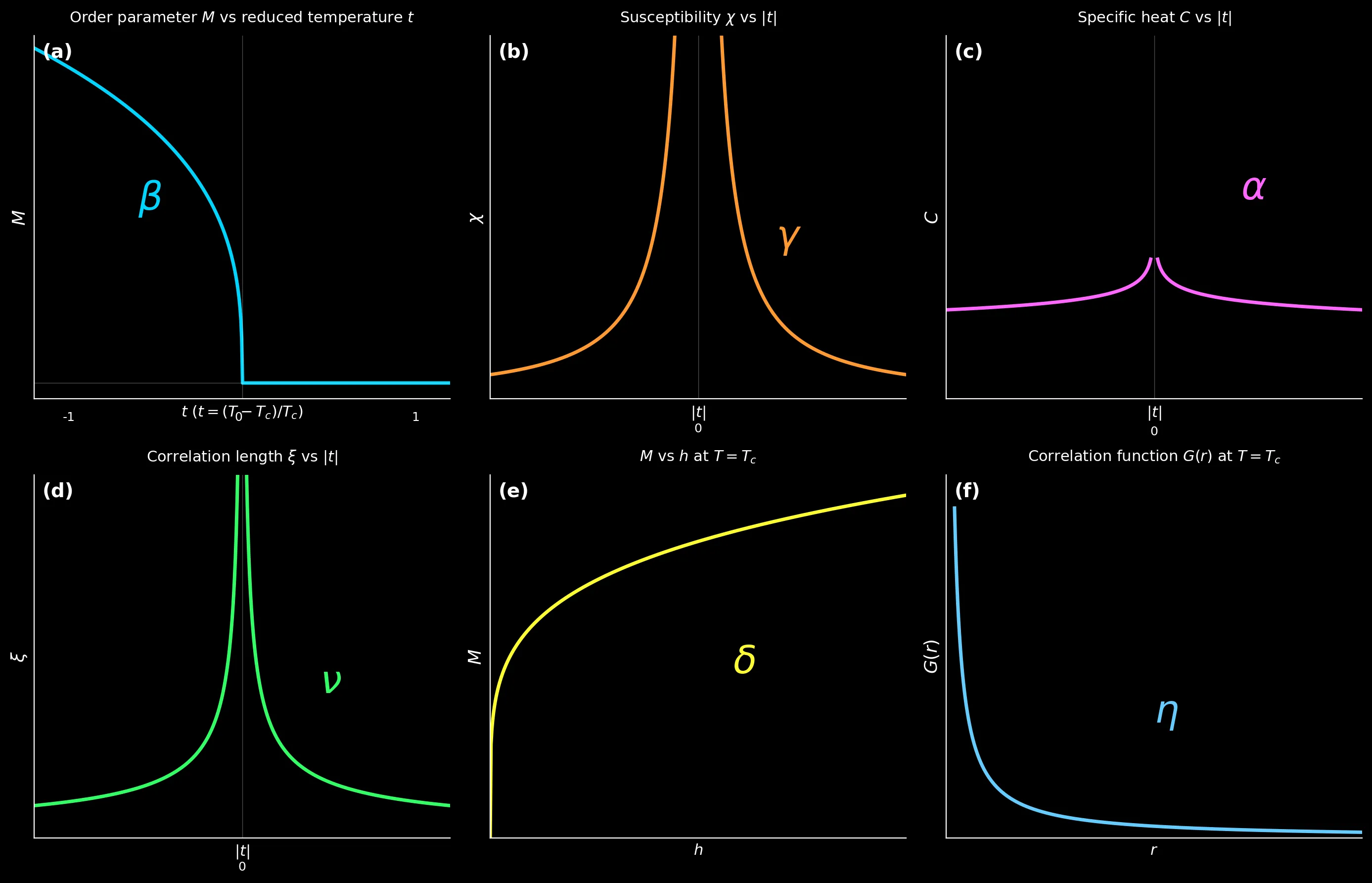 Schematic Diagram of the Physical Behavior of Six Standard Critical Exponents. (a) Order Parameter M Grows as M ~ (-t)^β on the Low-Temperature Side; (b) Susceptibility χ Diverges as χ ~ |t|⁻γ at the Critical Point; (c) Specific Heat C Diverges or Shows a Cusp as C ~ |t|⁻α; (d) Correlation Length ξ Diverges as ξ ~ |t|⁻ν; (e) Critical Isotherm M ~ h¹/δ Shows Nonlinear Response; (f) Correlation Function at Critical Point Decays as Power Law G(r) ~ r⁻(d-2+η). Source: Self-Drawn