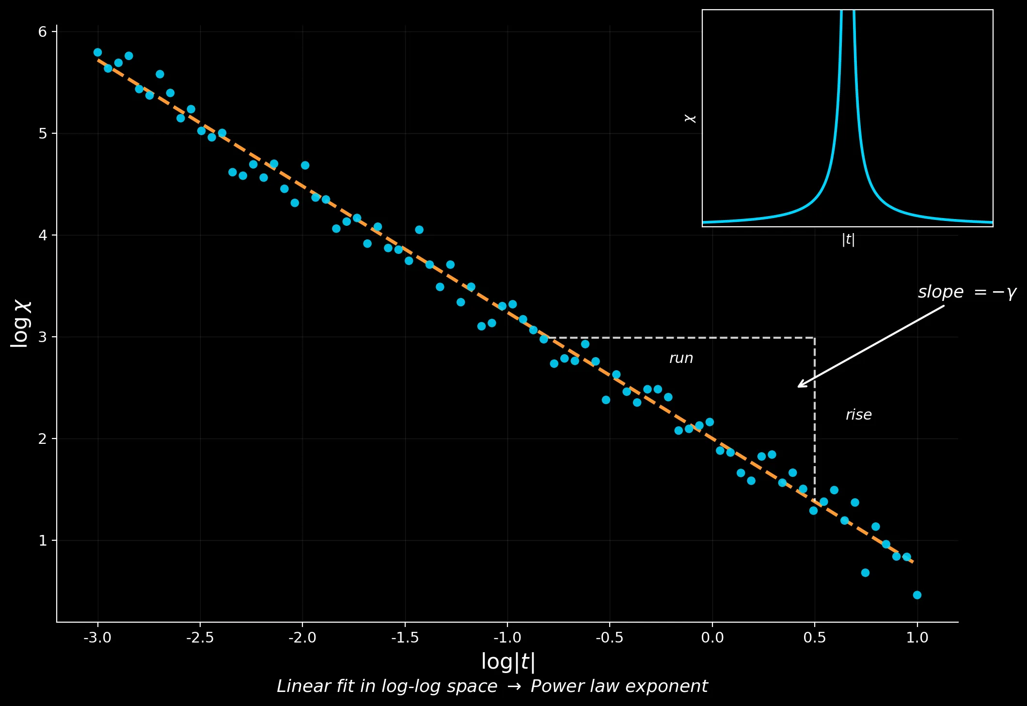 Extracting Critical Exponents from Log-Log Plots. The Main Plot Shows Susceptibility χ versus Reduced Temperature |t| on Log-Log Coordinates, Where the Power-Law Relationship Becomes a Straight Line with Slope -γ. The Inset in the Upper Right Shows the Divergent Behavior of the Same Data on Linear Coordinates, Contrasting the Two Representations.