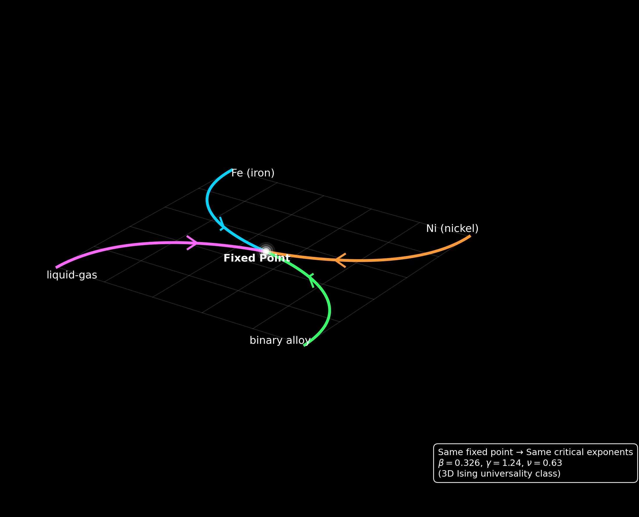 This picture can be understood with a simple analogy. Imagine a valley (fixed point) and rivers flowing toward the valley from all directions (RG flows). Different rivers start from different origins (different microscopic systems), but they all eventually converge into the same valley. Once near the valley, the behavior of all rivers is determined by the valley's terrain, independent of their origins. Critical exponents are parameters describing the "valley terrain"—they are intrinsic properties of the fixed point, independent of specific "rivers" (microscopic systems).