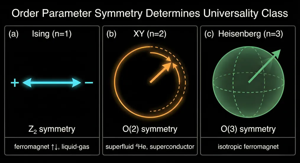Deeper meaning of universality classes: Different columns in the table represent different universality classes; systems in the same column share the same critical exponents. The deep reason for this fact is: what determines critical exponents is only the spatial dimension \(d\), the symmetry of the order parameter, and the range of interactions, independent of the microscopic details of the system (such as lattice structure, interaction strength, atomic mass). In the language of the renormalization group, systems in the same universality class converge to the same fixed point in the RG flow, and the critical exponents are determined by the properties of the fixed point. Section 6 will discuss the concept of universality classes in detail.