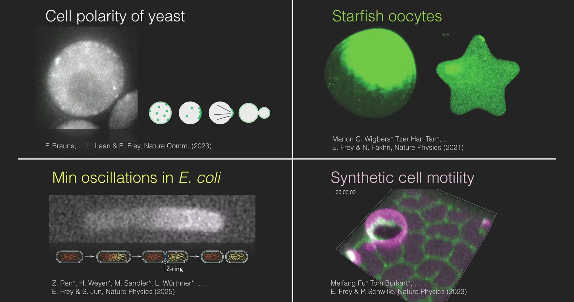The lecture then shifts from the macroscopic world to the microscopic cellular scale. Prof. Frey presents four cutting-edge research examples from his group. These cases are concrete applications of self-organization theory in biology and provide real-world research context for the theories to be developed in subsequent lectures.