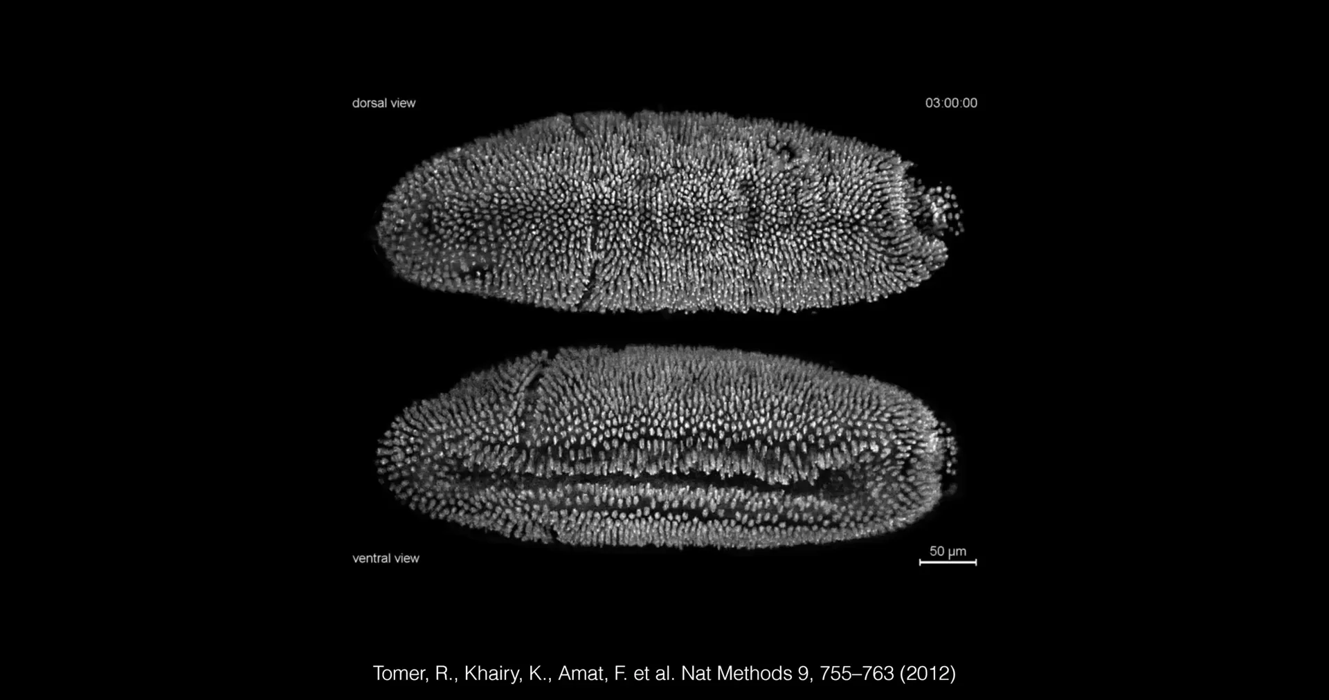 The professor also gives the example of morphogenesis in Drosophila. At a higher organizational level, how do living organisms form complex shapes? The image shows the early developmental process of a fruit fly embryo. Using light sheet microscopy for real-time observation, one can see how cells reorganize on a large scale, form different shapes, and eventually produce complex body structures such as segmentation. This is an instance of "morphogenesis," representing self-organization at the tissue dynamics level. Establishing theoretical descriptions for such complex life processes is one of the frontier challenges in this field.
