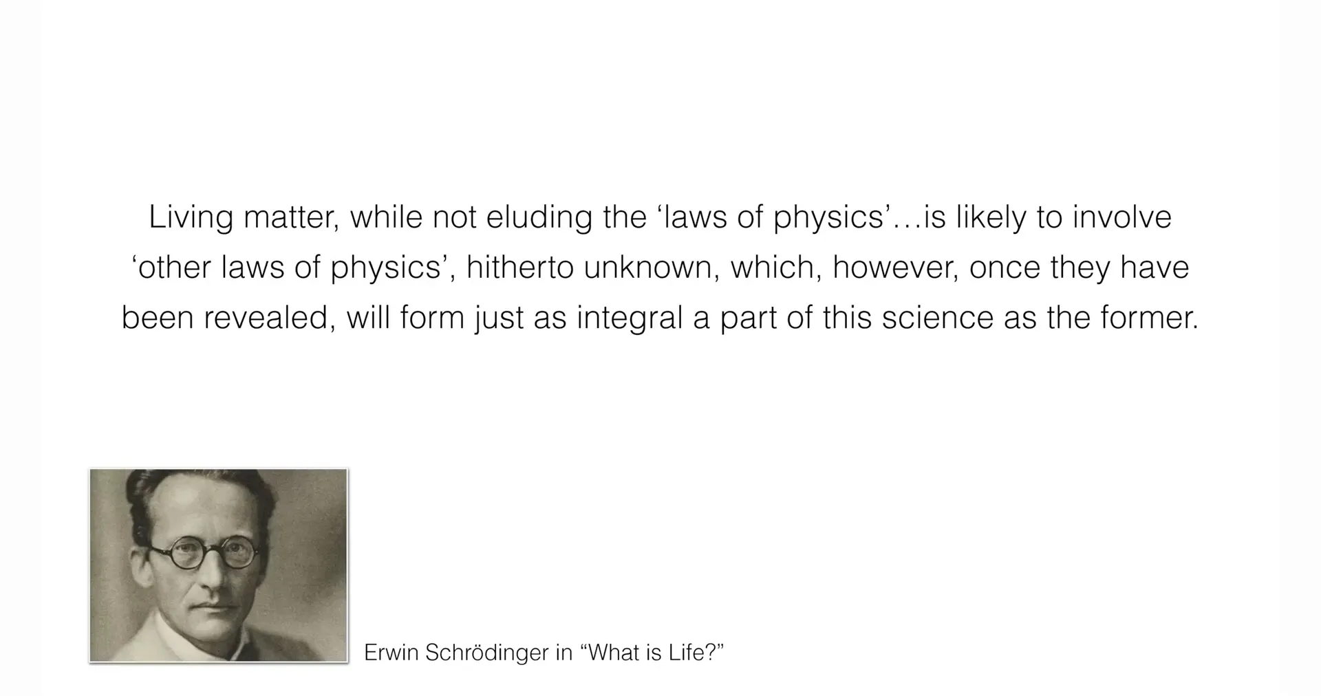 The lecture quotes physicist Erwin Schrödinger from his famous book What Is Life?: "Living matter, while not eluding the 'laws of physics'... is likely to involve 'other laws of physics' hitherto unknown, which, however, once they have been revealed, will form just as integral a part of this science."