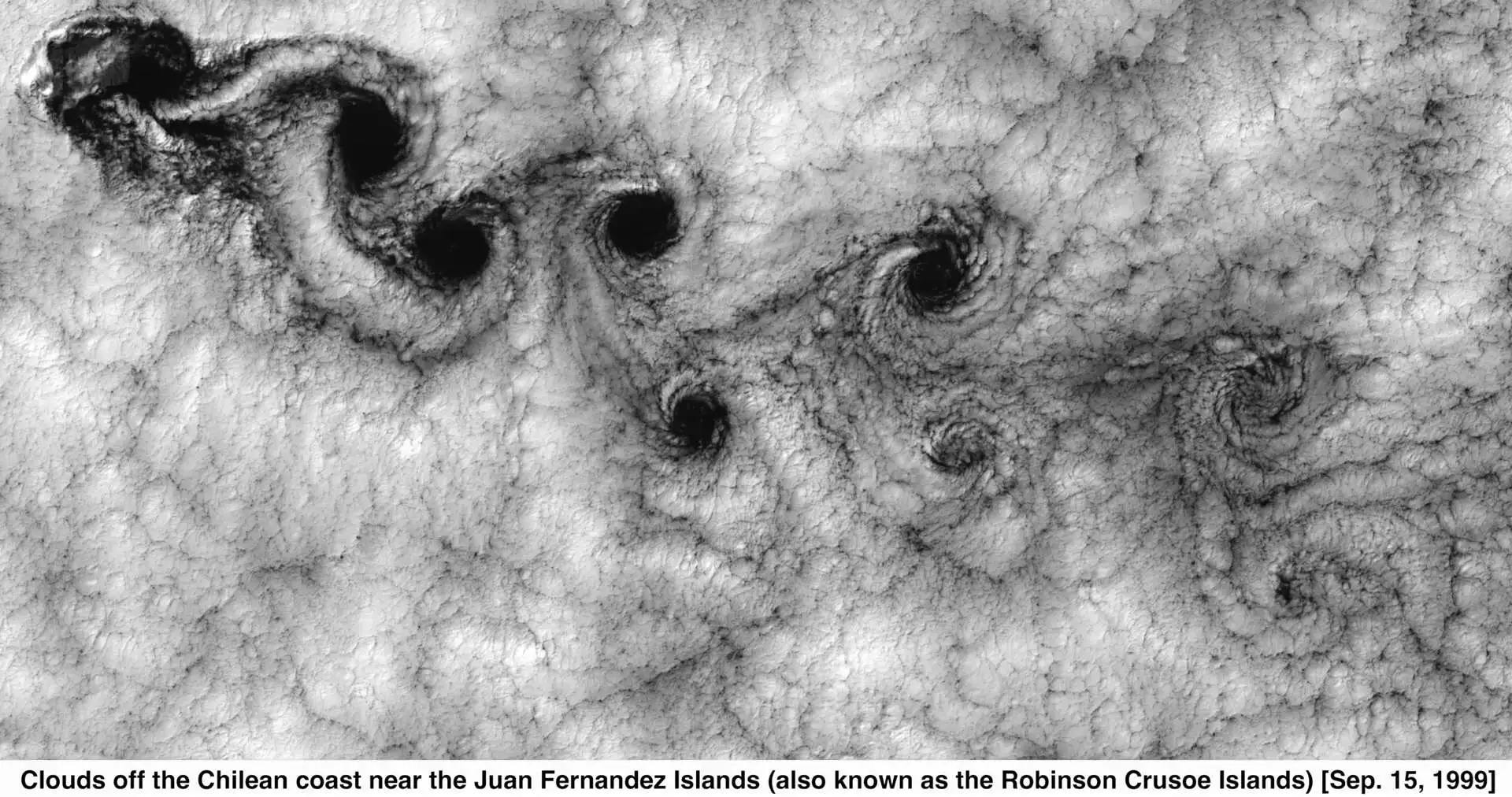 Von Kármán vortex street: Shows cloud layers above the Juan Fernández Islands forming regular vortex patterns behind the islands (obstacles).