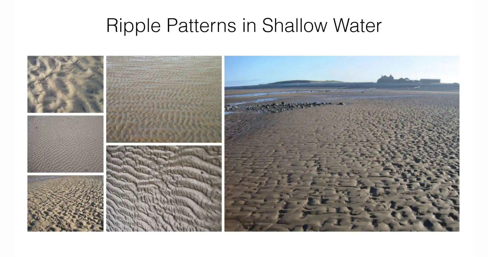 Ripple patterns: Shows various stripe-like or differently shaped ripples formed by the interaction of water flow and sand particles in shallow water.