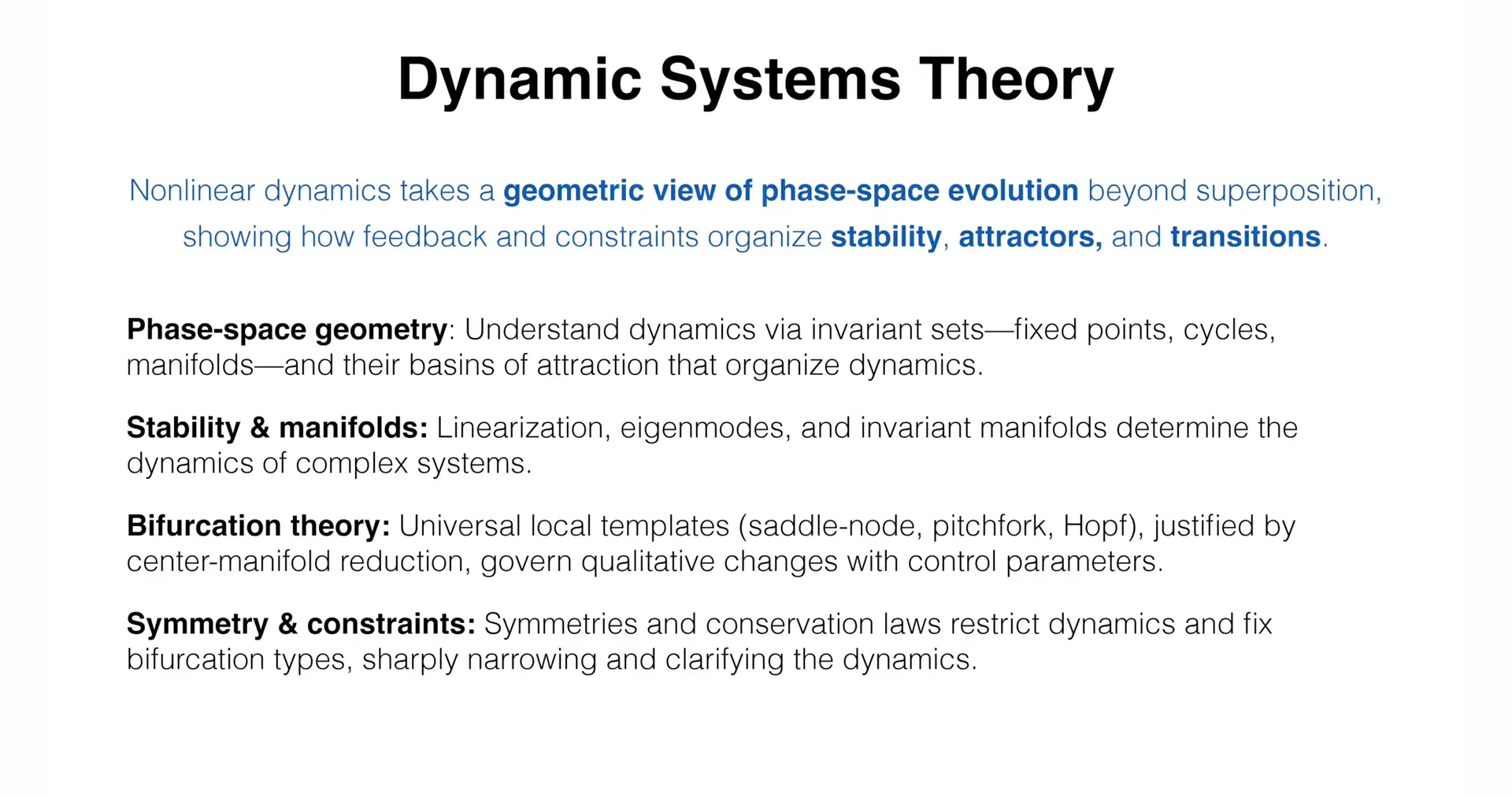 Nonlinear dynamics theory provides a geometric perspective for understanding system evolution, transcending the limitations of the "superposition principle" in linear systems. It shows how feedback and constraints organize stability, attractors, and transitions.