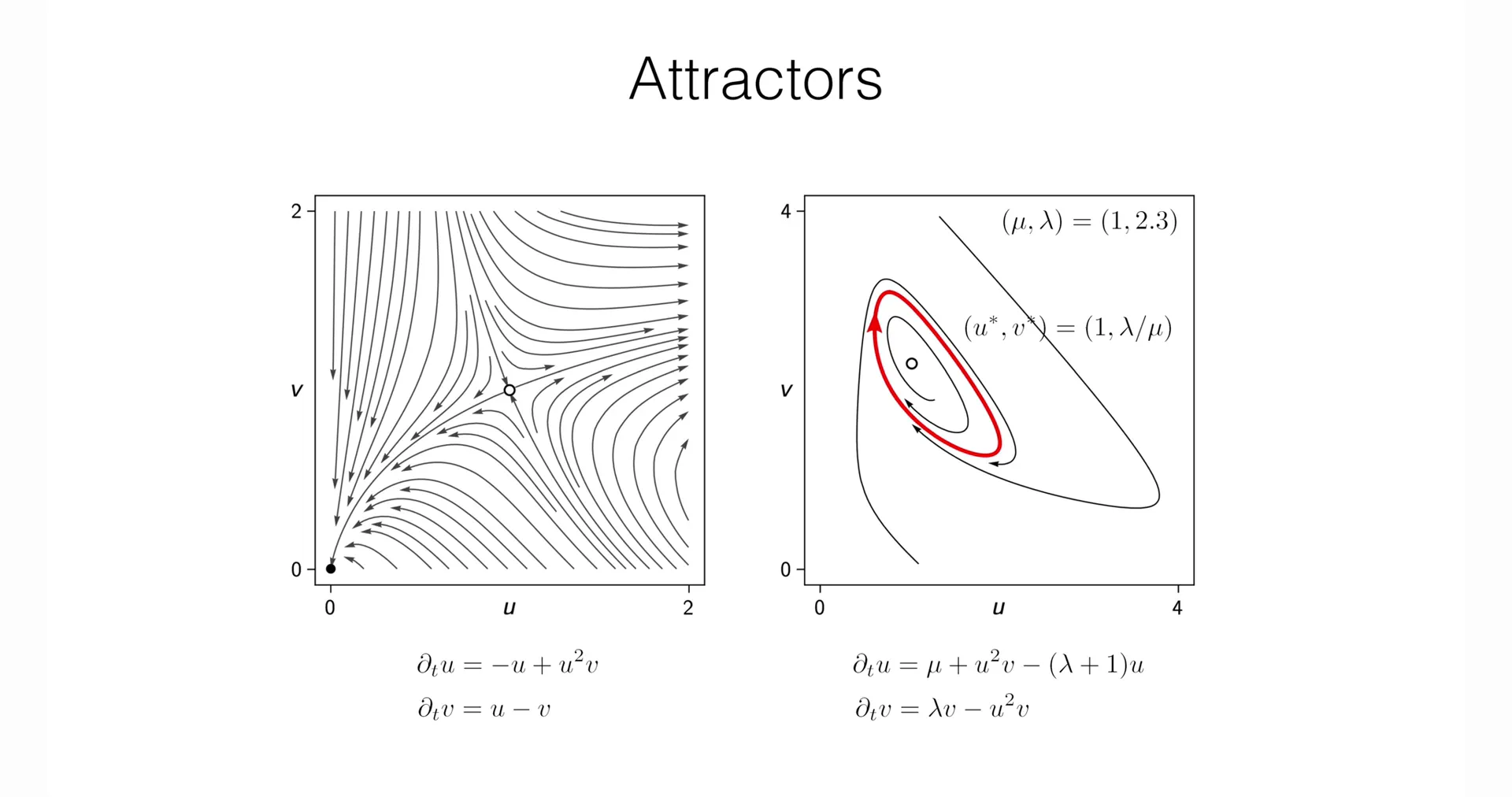 To illustrate the core concept of "attractor," the lecture begins with a simple two-dimensional system and gradually introduces more complex attractor types. The first example shows a two-dimensional phase space containing two "landmark" fixed points: an unstable saddle point (open circle) and a stable fixed point (solid dot). This stable fixed point is an attractor; all trajectories starting from within its "basin of attraction" will eventually flow toward and stop at this point, representing the system reaching a steady state. This system is described by the equations \(\partial_{t}u = -u + u^{2}v\) and \(\partial_{t}v = u - v\).