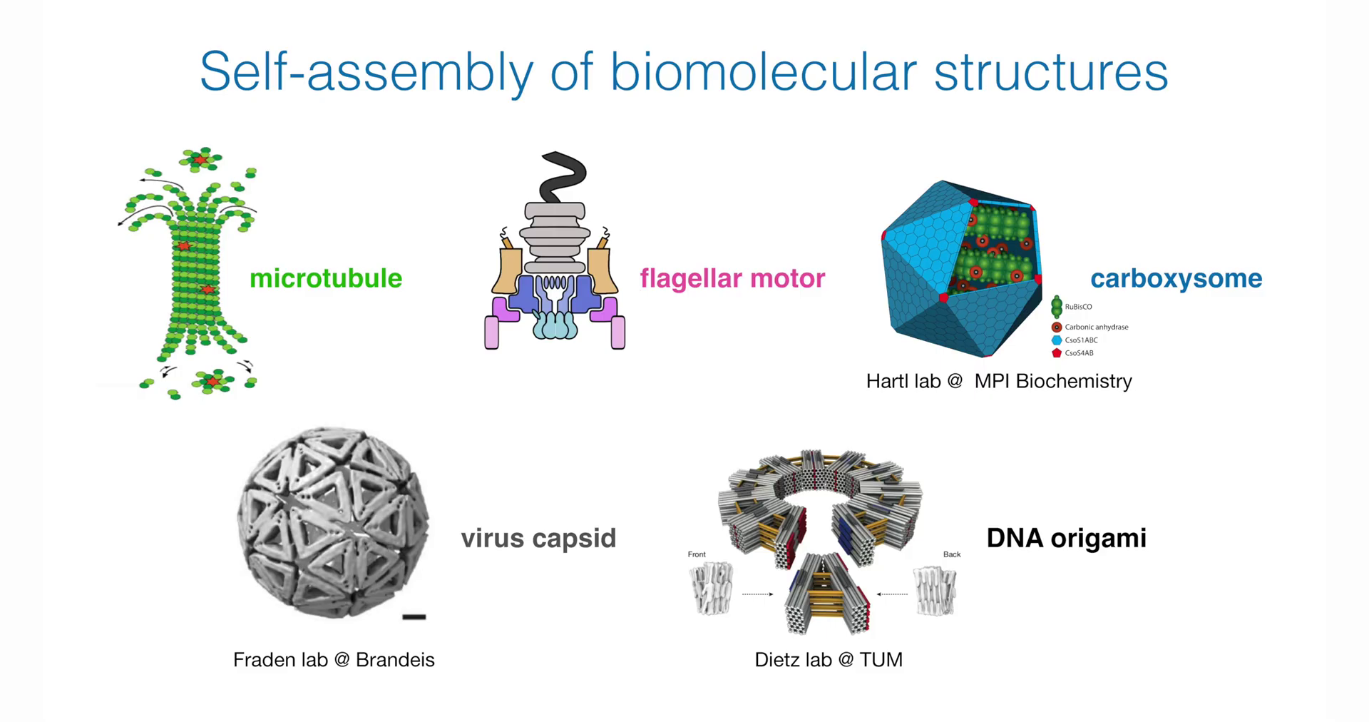 By contrasting with IKEA furniture (which requires external assembly), the professor emphasizes the uniqueness of biological systems. This slide lists various complex structures that spontaneously form inside living organisms, including microtubules, flagellar motors, virus capsids, and artificially designed DNA origami. The purpose of this figure is to visually present the core question studied in this field: How do these exquisite biomolecular machines automatically "assemble" from simple building blocks without external intervention.