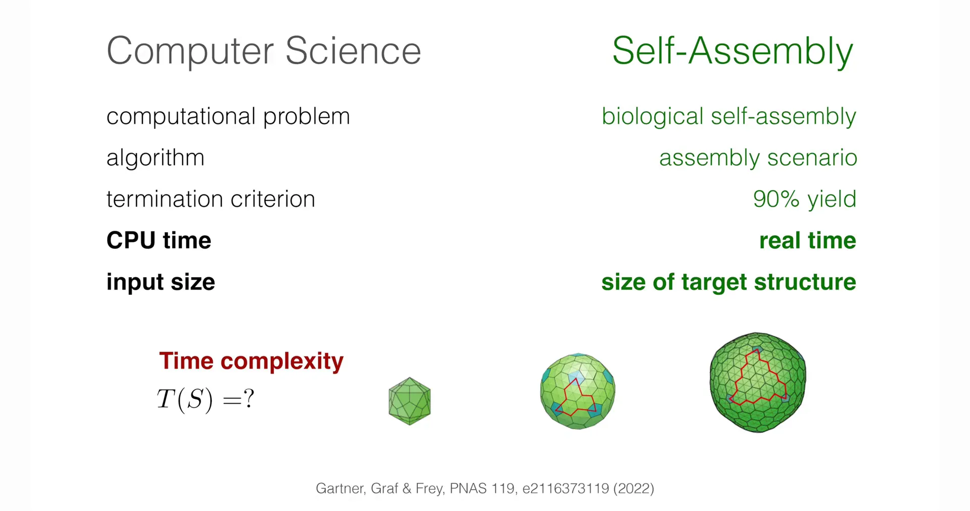Biological self-assembly can be analogized to a "computational problem." The slide establishes a one-to-one correspondence between computer science and self-assembly: the computer's "algorithm" corresponds to the biological system's "assembly scenario"; "CPU time" corresponds to "real time"; and "input size" corresponds to "size of target structure." Through this analogy, the professor introduces a key theoretical concept—"time complexity of self-assembly," i.e., how the real time required to assemble a structure (like a virus) changes with the size of that structure.