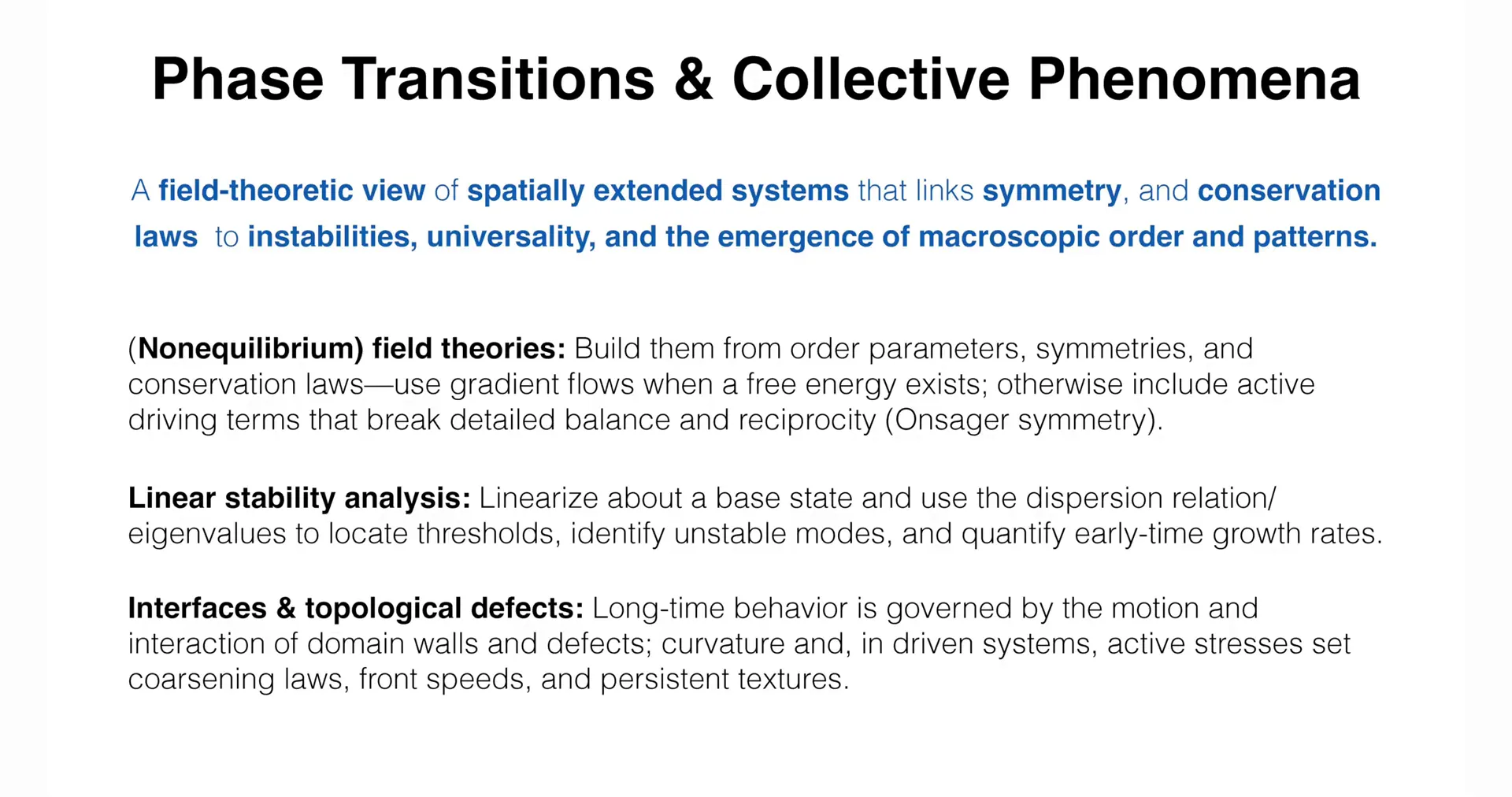 The second theoretical pillar of the course shifts perspective from systems described by a few variables (ordinary differential equations, ODEs) to spatially extended systems (partial differential equations, PDEs). In such systems, we focus on one or more fields that vary continuously in space and time, i.e., the order parameter \(\phi(\mathbf{x}, t)\), such as local concentration, density, or average molecular orientation. This is a field-theoretic view of spatially extended systems that links symmetry, conservation laws with instabilities, universality, and the emergence of macroscopic order and patterns.