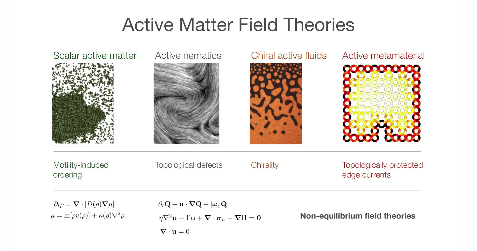 Nonequilibrium field theories: Theories describing the evolution of these fields are built from the order parameter, symmetry, and conservation laws. For systems near thermodynamic equilibrium, dynamics typically follows a "gradient flow," meaning the system evolves toward minimizing a free energy functional. However, for active systems, the situation is completely different. Build them from order parameters, symmetry, and conservation laws—using gradient flows when a free energy exists; otherwise, include active driving terms that break detailed balance and reciprocity (i.e., Onsager symmetry).