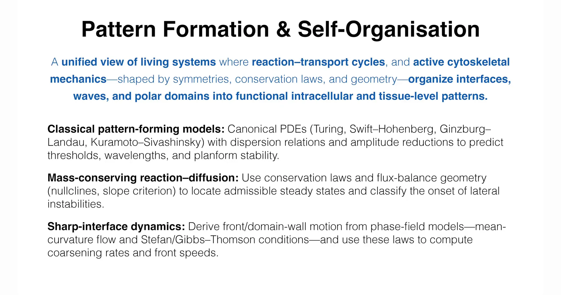 The third theoretical pillar of the course aims to synthesize the tools and ideas from the first two pillars (dynamical systems theory and nonequilibrium field theory) to address how functional patterns arise in biological contexts. The core here is reaction–transport cycles and active mechanics dominated by the cytoskeleton.